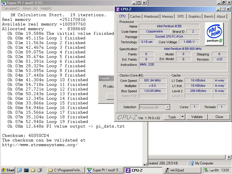 Appena finito con i bench metterò il resto intanto ecco quelli di CPU-Z e Super PI con entrambe le CPU, e con il PIII 800 sulla CUSI-FX.