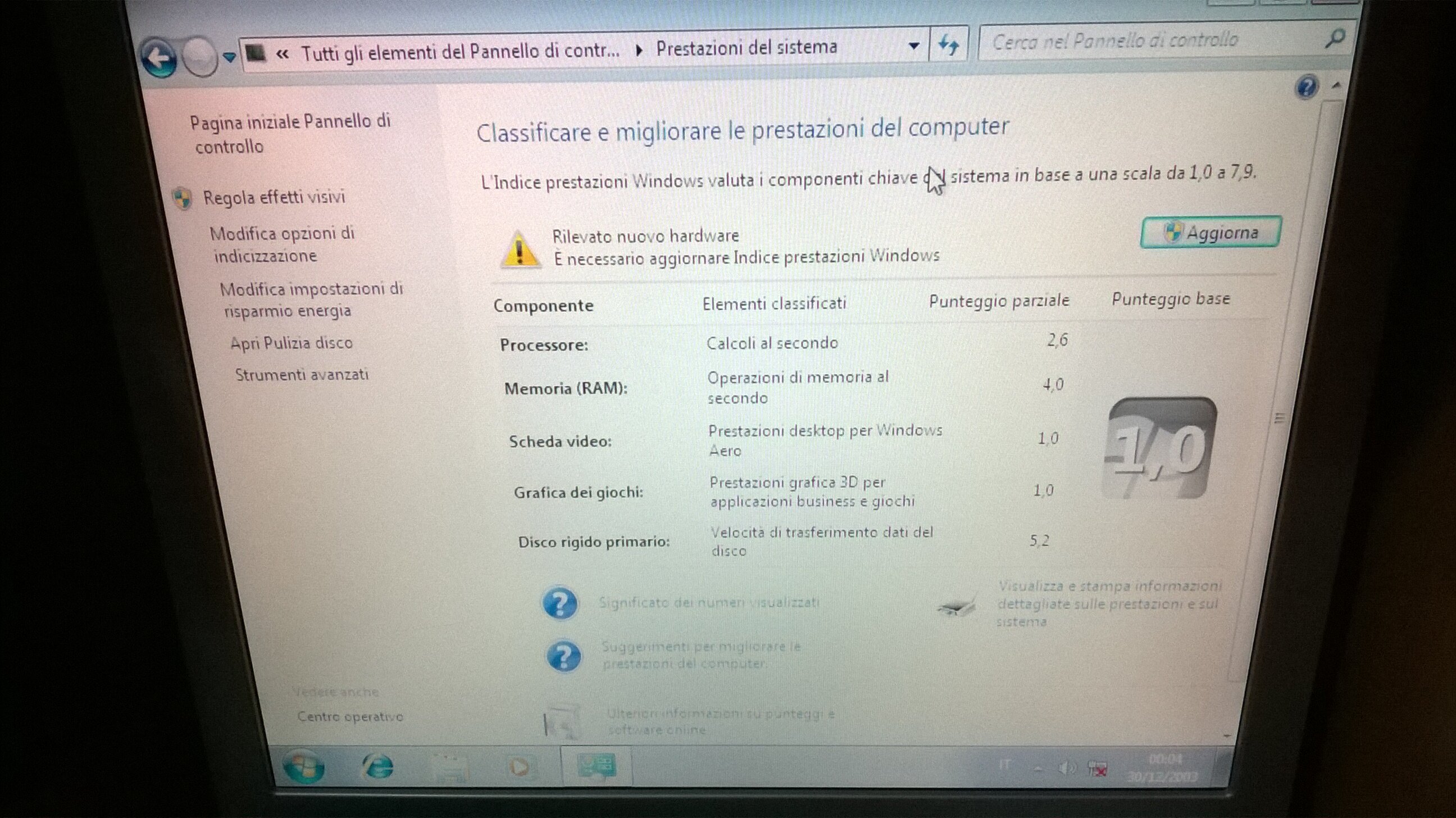 Purtroppo crashando:crashpc:/emoticons/crashpc.gif.654e11ba7ae72c2f891878ae322b3326.gif" title=":crashpc:" width="40" /> non mi permette di aggiornare il punteggio del processore, con il P4 2GHz era di soli 2,6, con il Prescott 2,8GHz penso sia possibile arrivare intorno ai 4,0, e credo possa migliorare anche di qualche decimo la memoria RAM (P4-2000 a 4,0) pur con solo 1GB on-board.