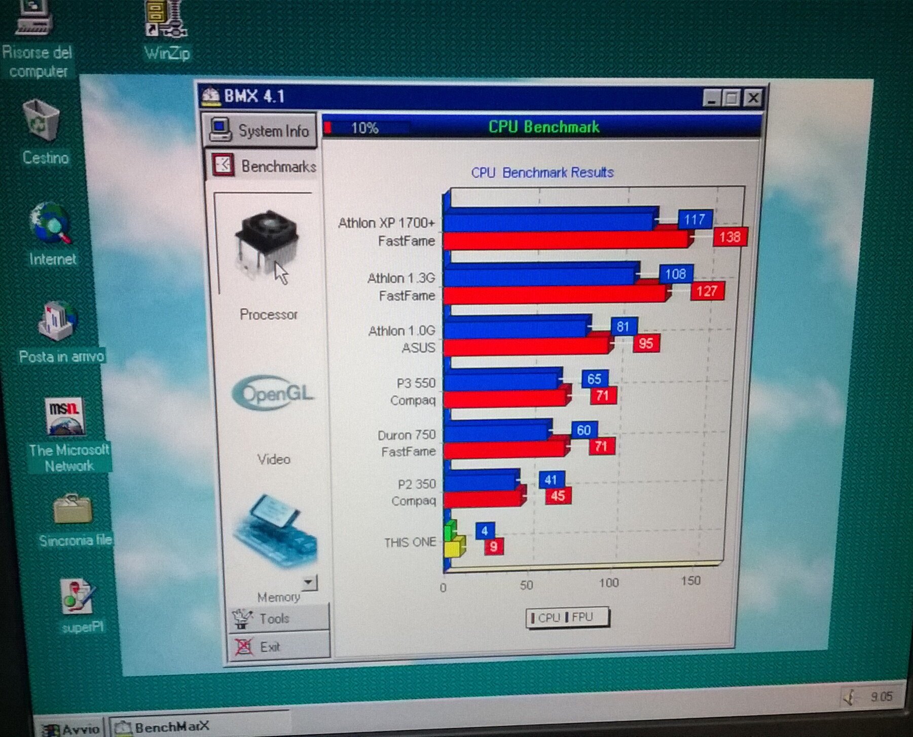 Mi rimane da risolvere il problema della Scheda LAN IBM 10/100, dovrei identificarla esattamente e caricare i driver x W9X, poi c'è da capire se installando le porte USB si possano usare con il W95 prima edizione (teoricamente no), nel frattempo ho eseguito alcuni bench tra cui il super PI, alcuni non funzionano tipo bmx che dice manchi un file, vedrò di trovarlo e farlo girare anche se magari il risultato non è interessante, appena termino la configurazione di W95 e fatti tutti i bench possibili cambio CPU, vorrei provarci alcuni pezzi non proprio comunissimi tipo il Winchip C6-200 e il 5K86-75, dopo testerò alcuni K6-2 iniziando da frequenze basse 166-200 e salendo fino a 400-450 (se non si arroventano i mosfet).