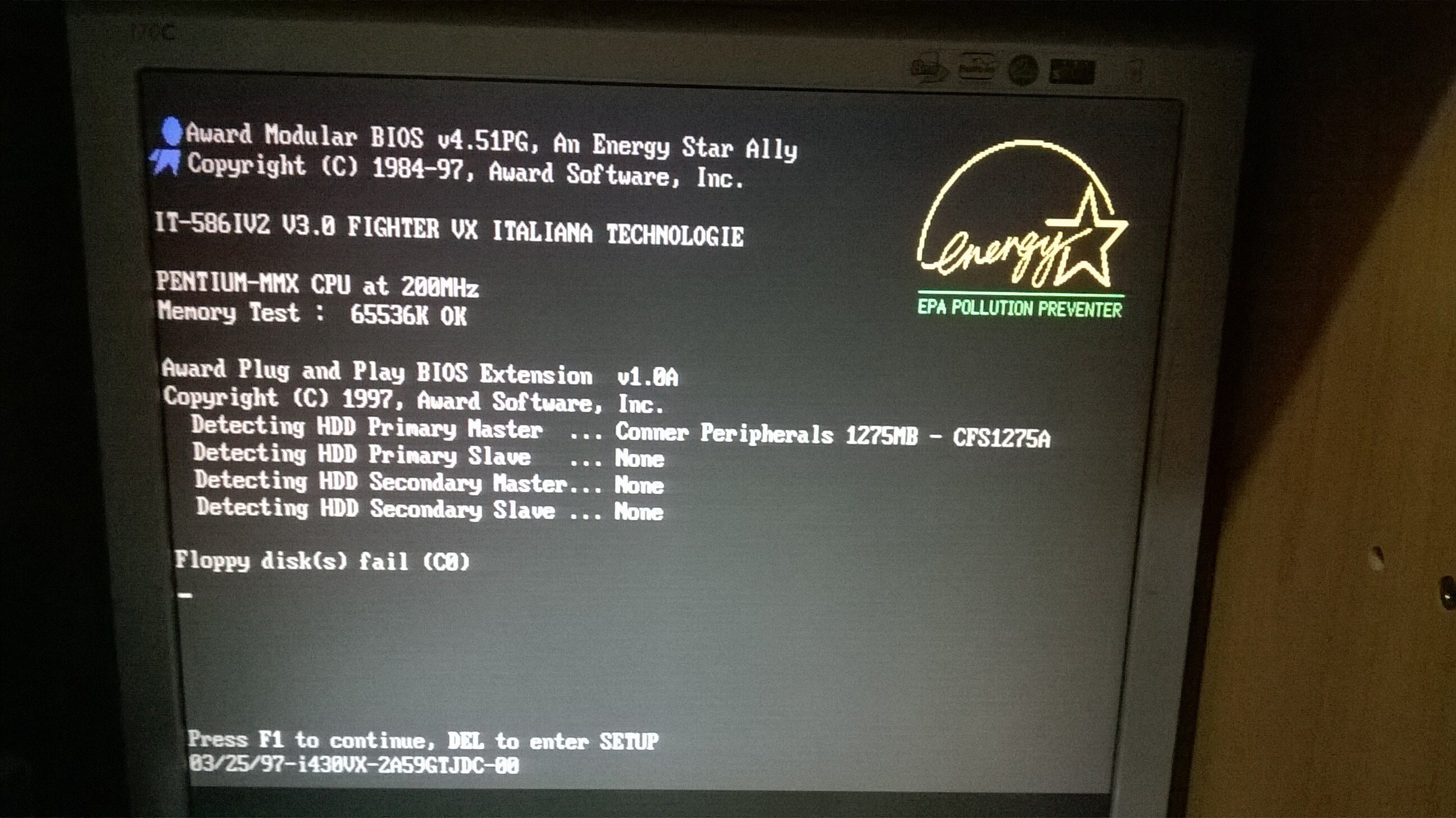 Tornando alla MB in questione TM-586 IV2, oggi l'ho sistemata cambiando un TIP110A, il problema era sia il dual voltage non funzionante che l'impossibilità di andare a 200MHz o più, in effetti avrei potuto provare se andava a 180 ma non l'ho fatto. Adesso funziona sia con un P166MMX sia con un P200MMX, ovviamente ho lasciato il 200 per iniziare a farci qualche bench, sto ancora in fase di configurazione attualmente ho una scheda Video S3 Trio64V2/DX credo da 2MB (4 chip HM514256DJ6), come HD uso un vecchio Conner CFS1275A da 1.275GB malgrado l'età di 25 anni riesco ancora ad avviarlo e far partire il W95Plus! , è comunque uno di quei HD tipo palla al piede (stra lento) ma considerato il PC per farci bench può andare, al limite dopo posso provare il CF da 512MB e vedere se ci sia un netto miglioramento (probabile).