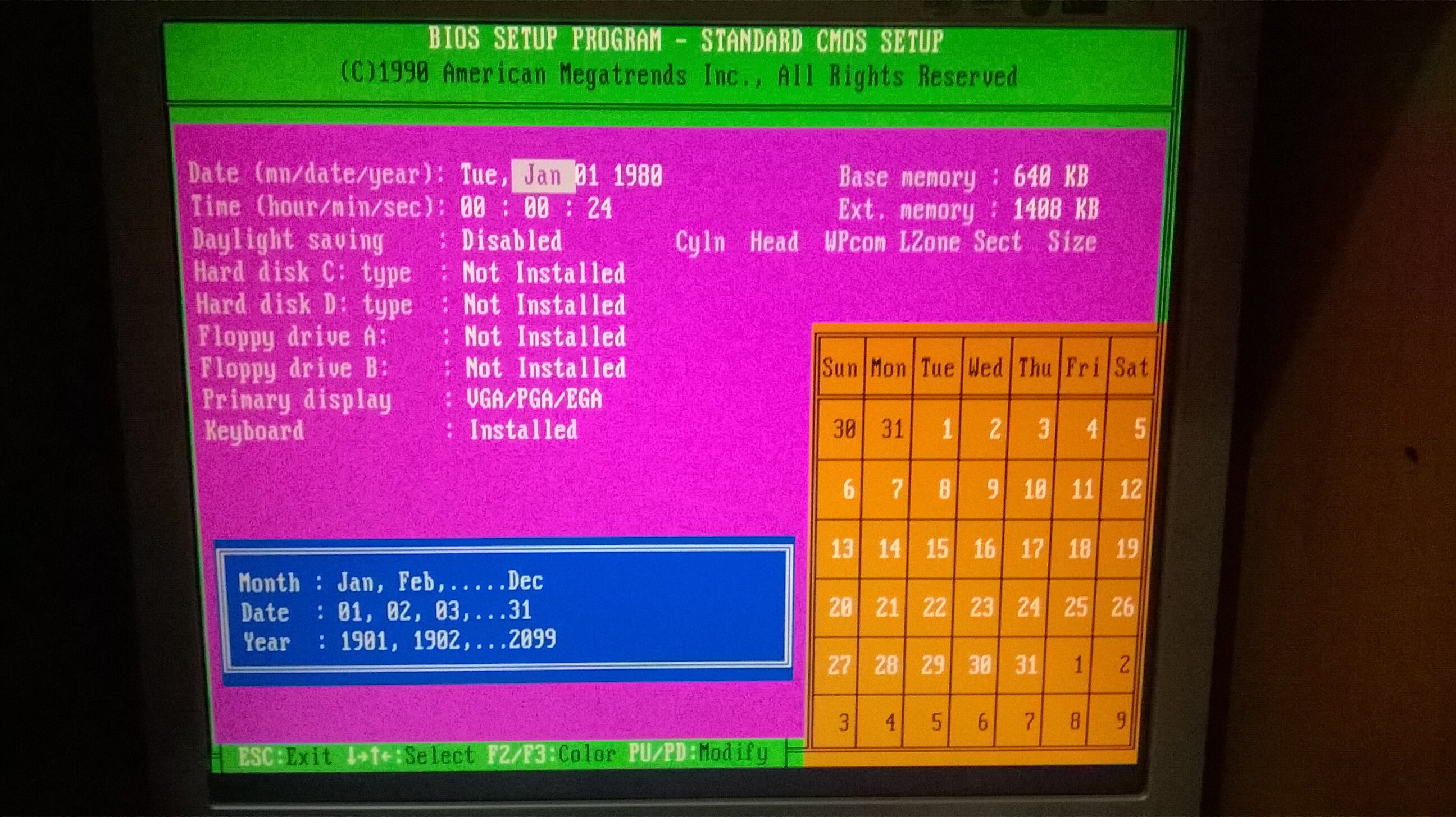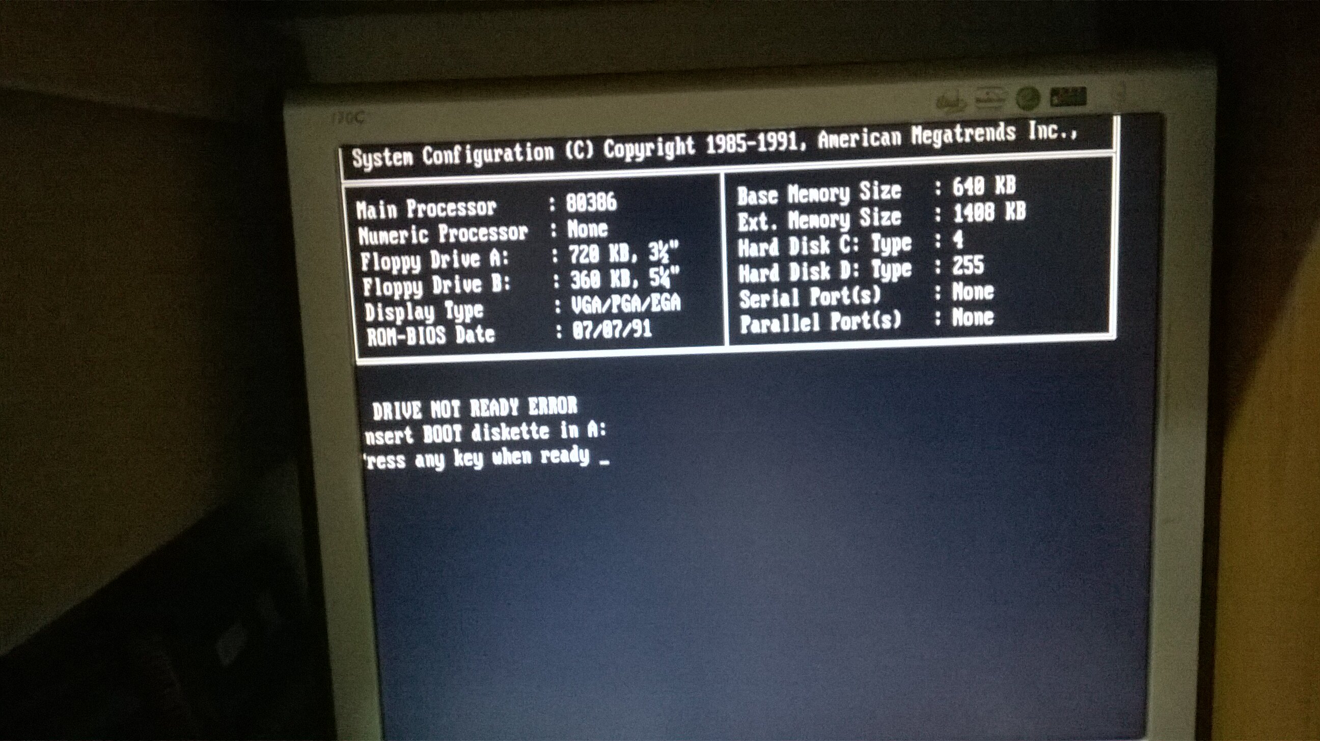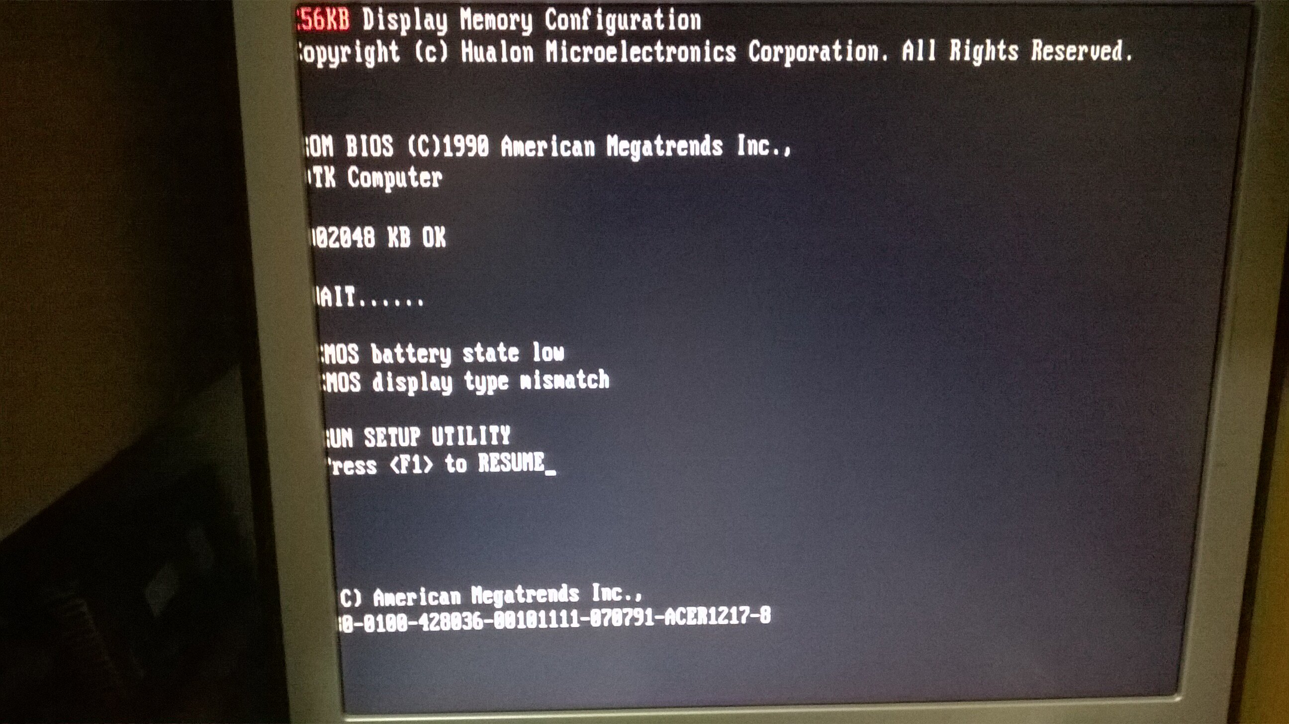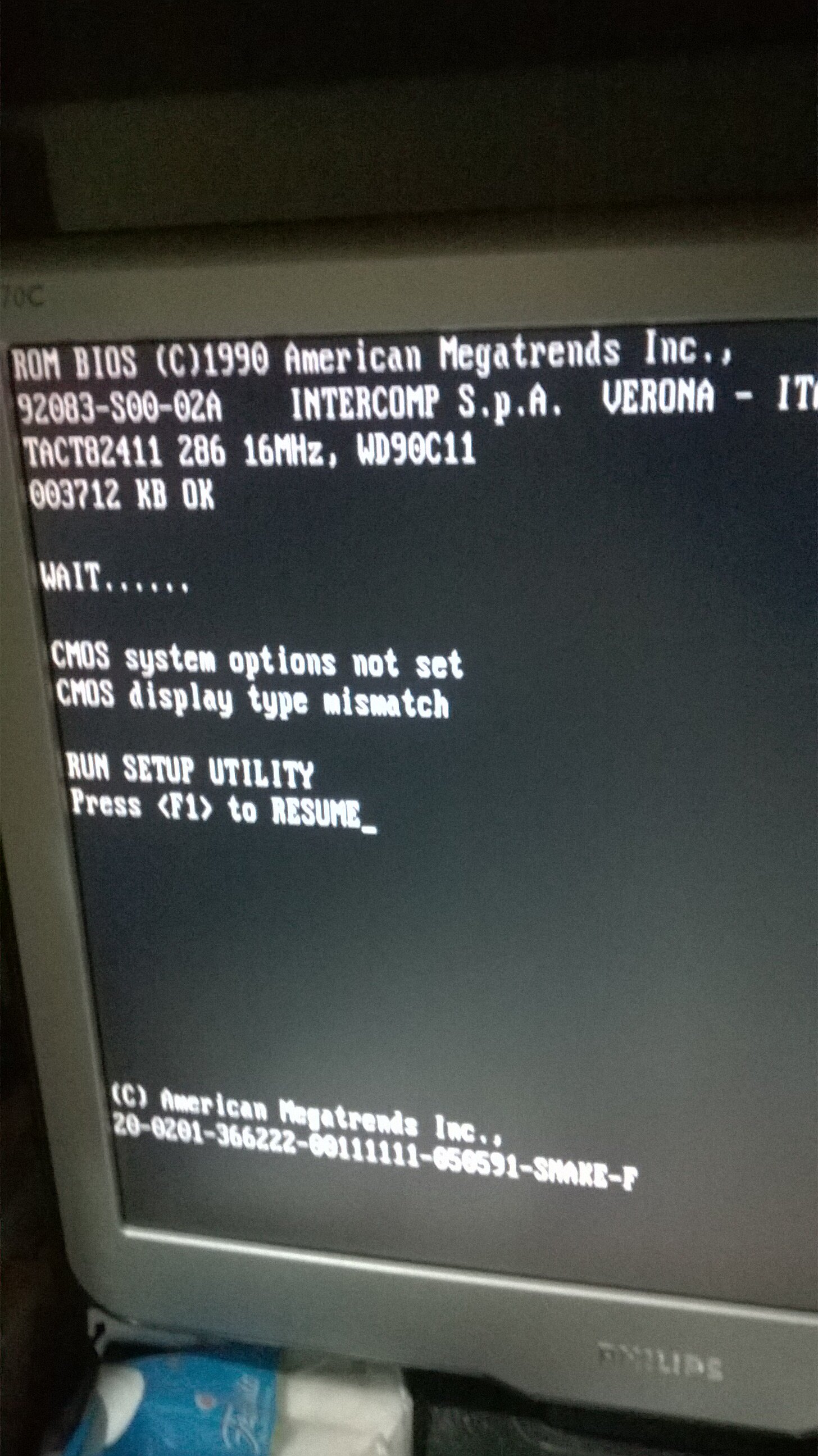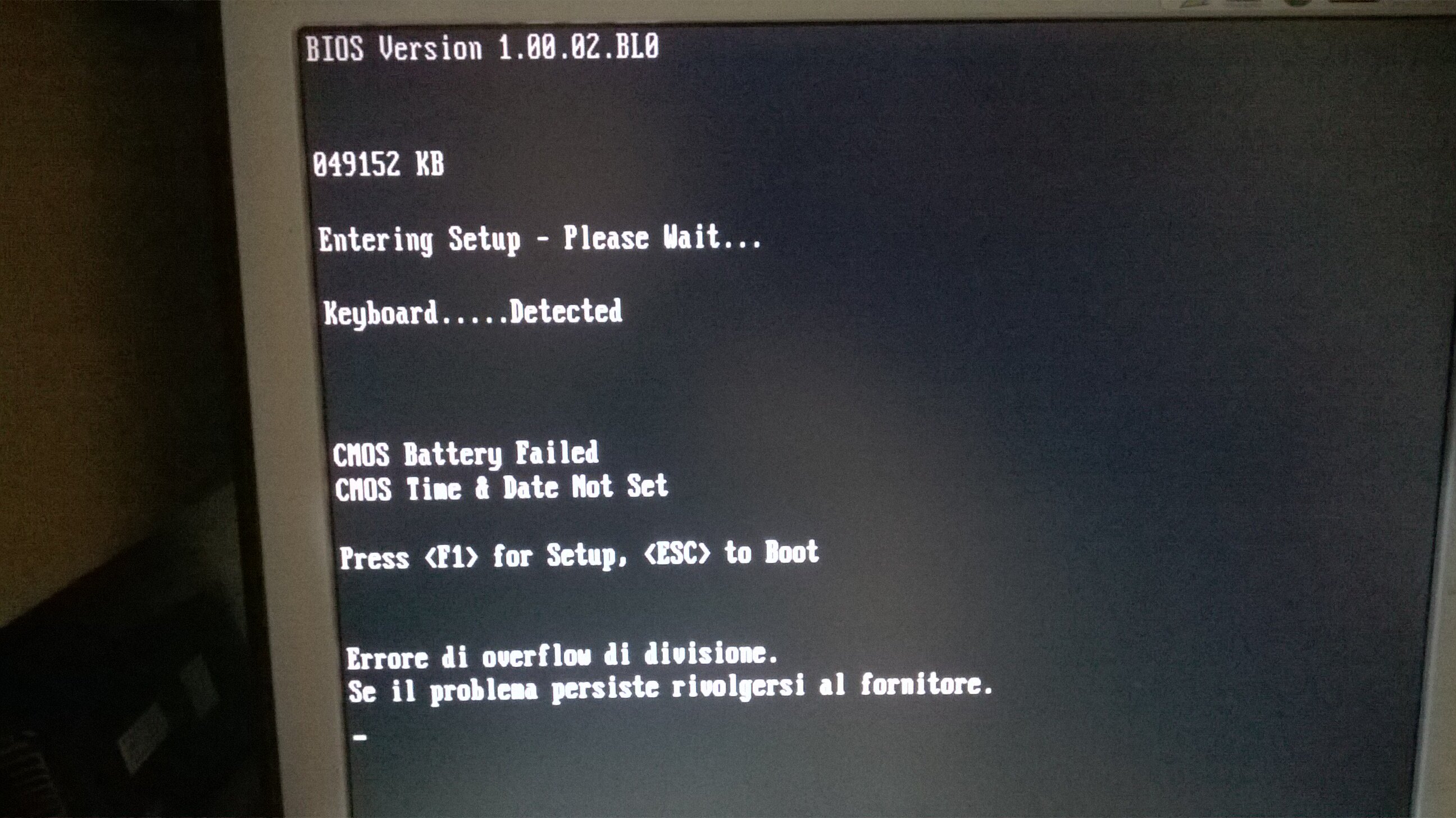 Purtroppo ha un chip RTC dallas con batteria scarica, bisogna fare il MoD., è un DS12887, non è tanto per la Batteria scarica ma per le info del BIOS che ad ogni avvio si perdono, inoltre c'è un baco al bios almeno per il momento non si entra premendo F1, premendolo il PC si blocca. L'unica cosa possibile è avviarlo da floppy. ma anche qui per il momento non va, forse è il lettore oppure i floppy che difettano, dovrei provarne altri sicuramente funzionanti e vedere che succede (cioè se parte).