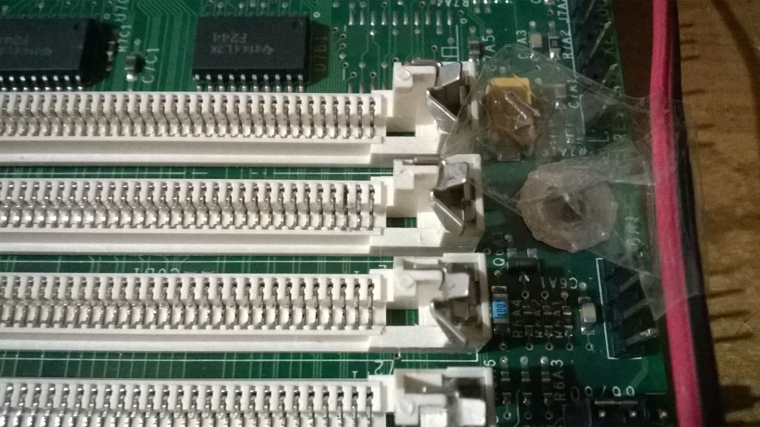 Tornando alla MB si avvia correttamente visualizzando la schermata del BIOS, da qui rilevo la versione del BIOS AMI 1.00.02.BL0, la RAM installata è di soli 48MB mentre le RAM sono tutte da 16MB ciascuno (quindi sarebbero 64MB), provando e riprovando le due coppie, noto che una coppia di 16MB viene letta per metà, quindi la sostituisco con una coppia da 8MB ciascuno, adesso i 48MB sono rilevati correttamente, noto in uno degli slot RAM un Pin tra i 72 che è piegato e va quasi a toccare quello vicino, purtroppo non sono riuscito a raddrizzarlo perché si è rotto, ma malgrado questo le RAM vengono lette correttamente, forse è un PIN di massa o comune quindi l'assenza non si nota.