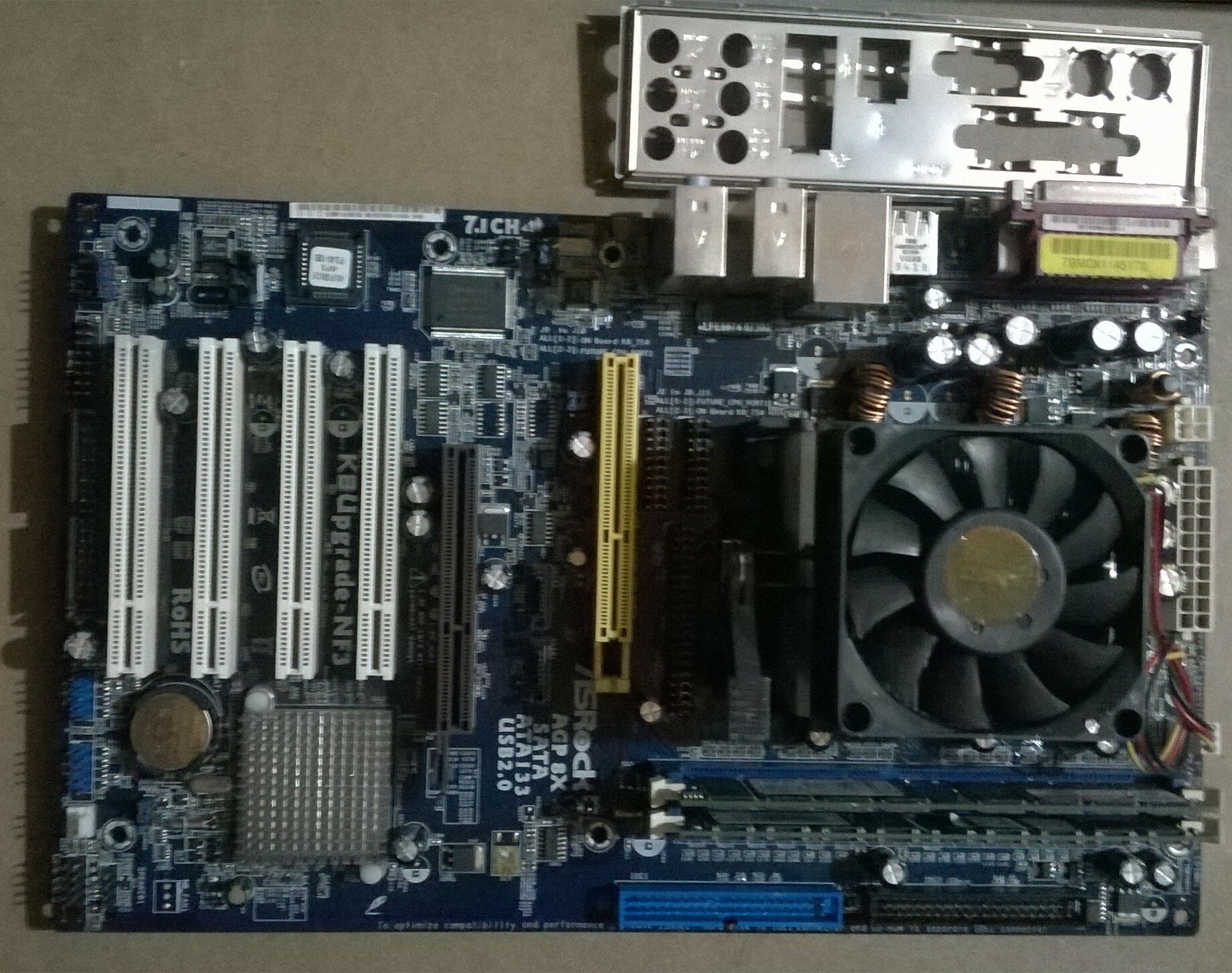 La scheda è completa di RAM (2 moduli di 512MB DDR400) totale 1GB, CPU Sempron 3x00+ se non erro 1.8GHz, disspatore con fan AMD e mascherina porte.