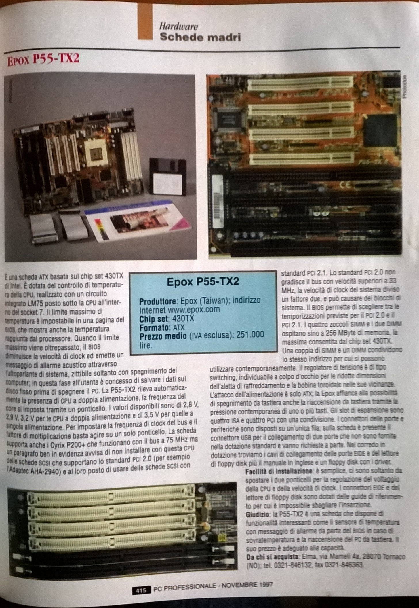 Metto alcune delle altre immagini di schede madri, prese dalla rivista di informatica, sempre in tema di socket 7, non so siano leggibili, ma eventualmente posso fare dei dettagli, faccio notare però che le foto non sono molto definite, a quei tempi non era possibile avere immagini come quelle odierne, la risoluzione era nettamente più bassa, e probabilmente quelle foto della rivista, potrebbero non sono state fatte con macchine fotografiche digitali, allora era più semplice usare quelle del periodo con i rullini.