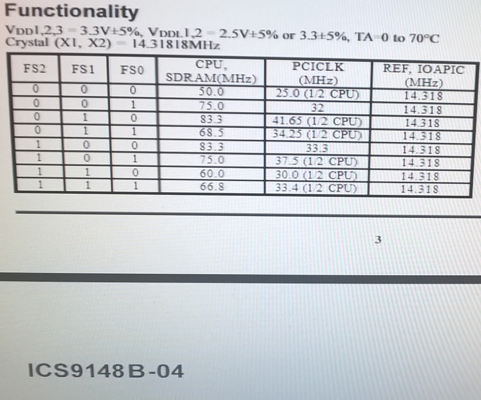 L'unica cosa che ho fatto, ma è da verificare se è corretta, è cercare info sul generatore di clock, il chip è un ICS 9148BF-04, ho cercato e trovato un documento pdf in cui ci sono info utili, ma forse non è proprio quel chip, perché è siglato ICS 9148B-04, comunque come potrete vedere, stando a quello che si può leggere, non si possono selezionare 55MHz di FSB, però ho trovato altre selezioni molto interessanti, se corrispondono e funzionano, si può tranquillamente mettere un K6-2 a 450 MHz, o anche a 500 MHz, ma anche le altre CPU possono usare quelle particolari selezioni, e si possono ottenere prestazioni migliori a frequenze simili, questo grazie al particolare divisore usato da quel generatore di frequenza.