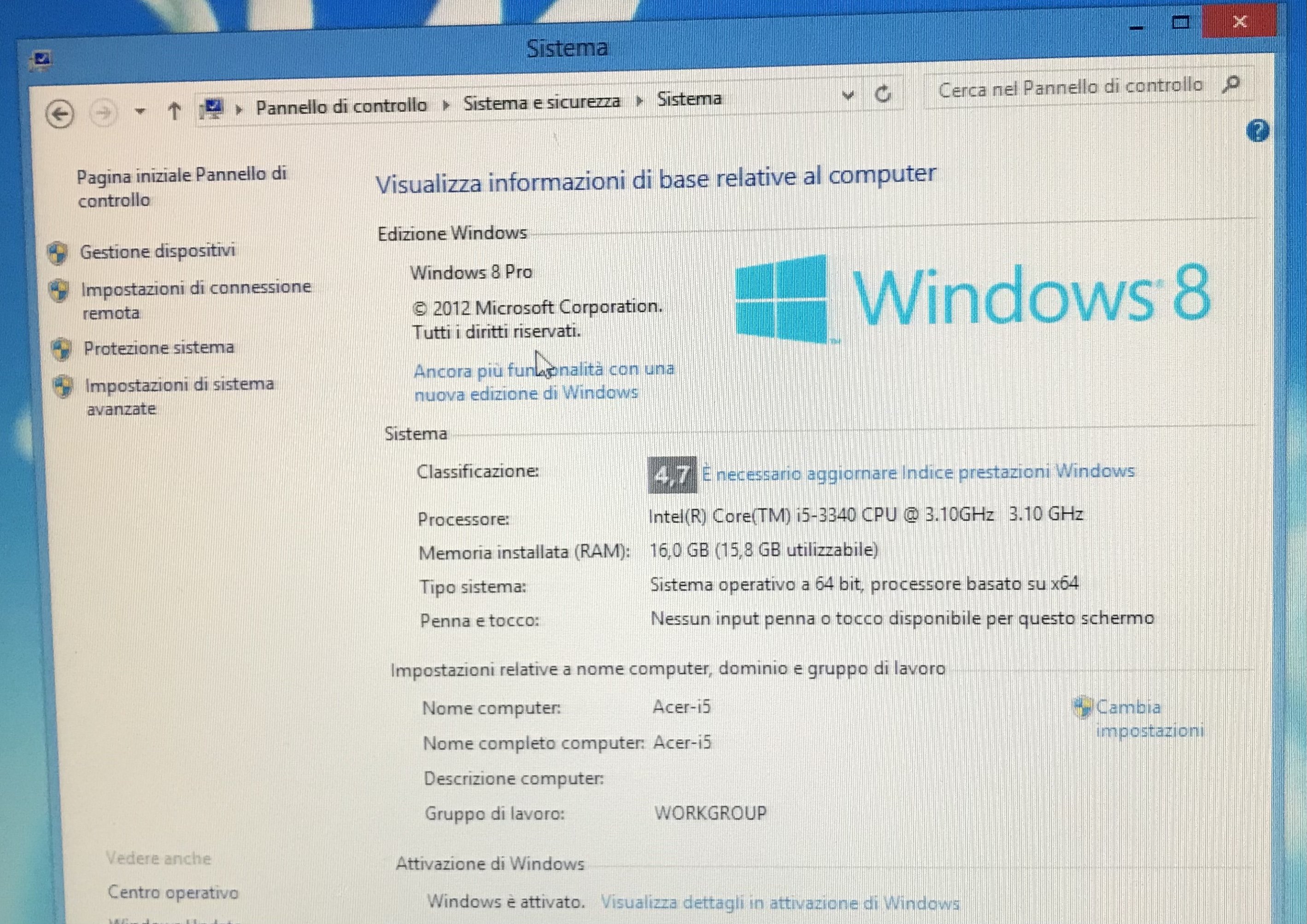 Breve aggiornamento sul i5, ho appena ? finito l’installazione di Windows, la scelta è stata difficile ?, ma ho caricato W8PRO 64bit, ho pensato che era inutile mettere 7 per poi passare a 8 o 10, comunque è stato relativamente veloce, è vero che ho scelto l’installazione predefinita, ma il risultato finale, è stato ottenuto abbastanza rapidamente, adesso resta da completare l’installazione e la connessione a internet.