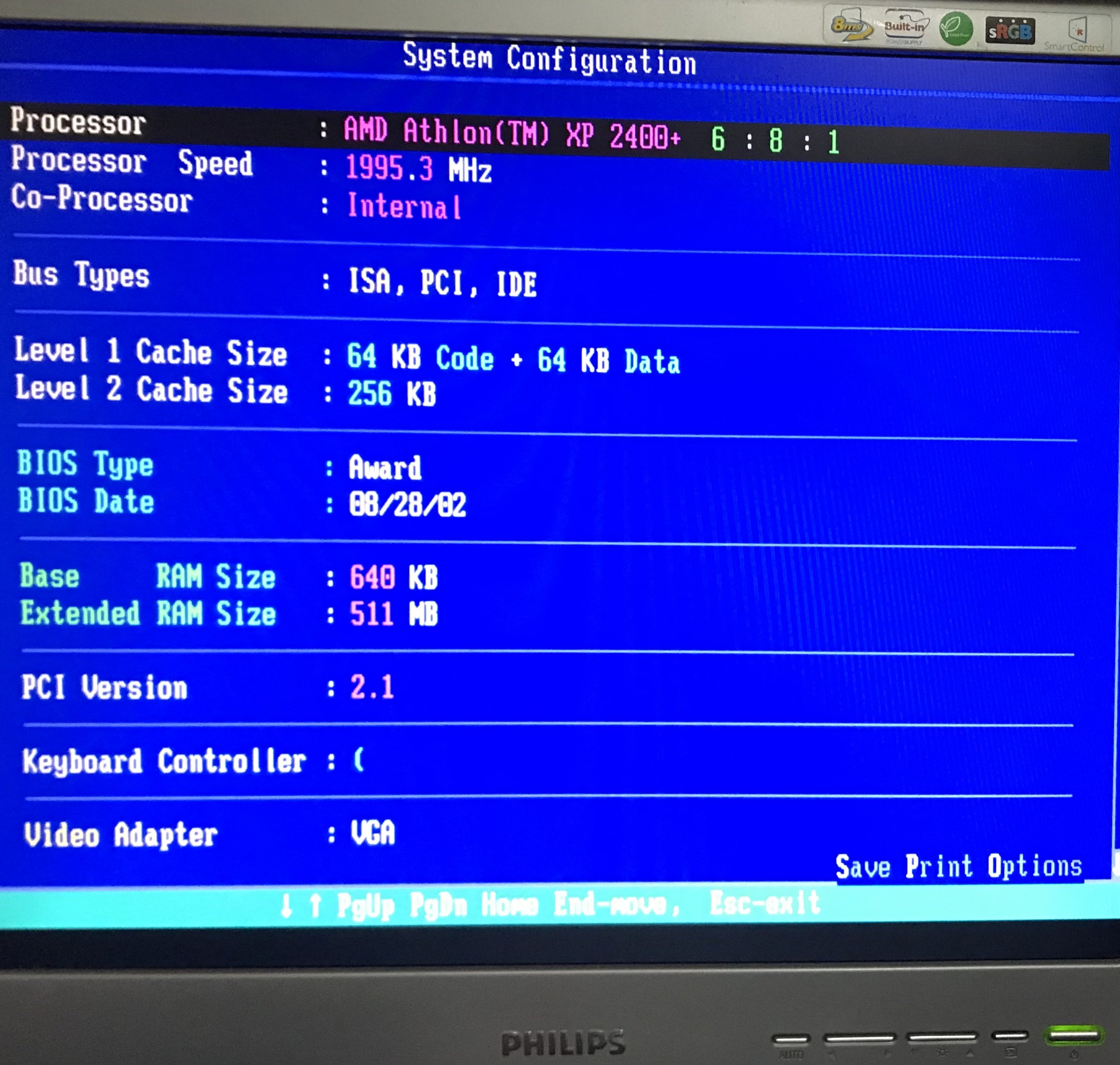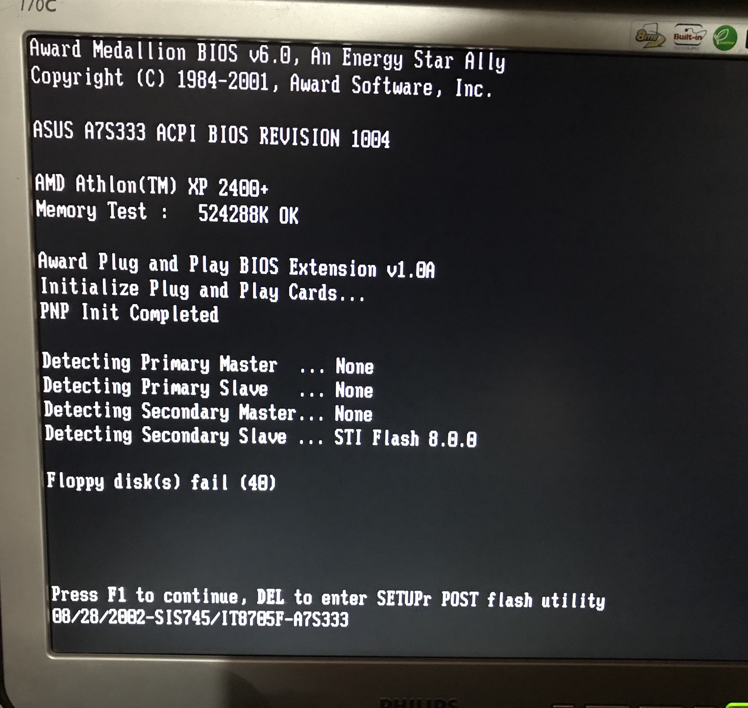 Dunque, poco fa ho terminato un breve test con l’A7S333, ho collegato tastiera e adattatore IDE CF, con scheda di memoria contenente DOS, ho avviato e memorizzato cambiando nel BIOS la velocità, adesso è settato come XP2400+ (2000MHz), forse ? inizialmente si sarebbe potuto lasciare a 1500?, comunque vedremo se nei prossimi avvii restano in memoria, oppure se occorre sostituire la batteria ? (immagino di sì). ?