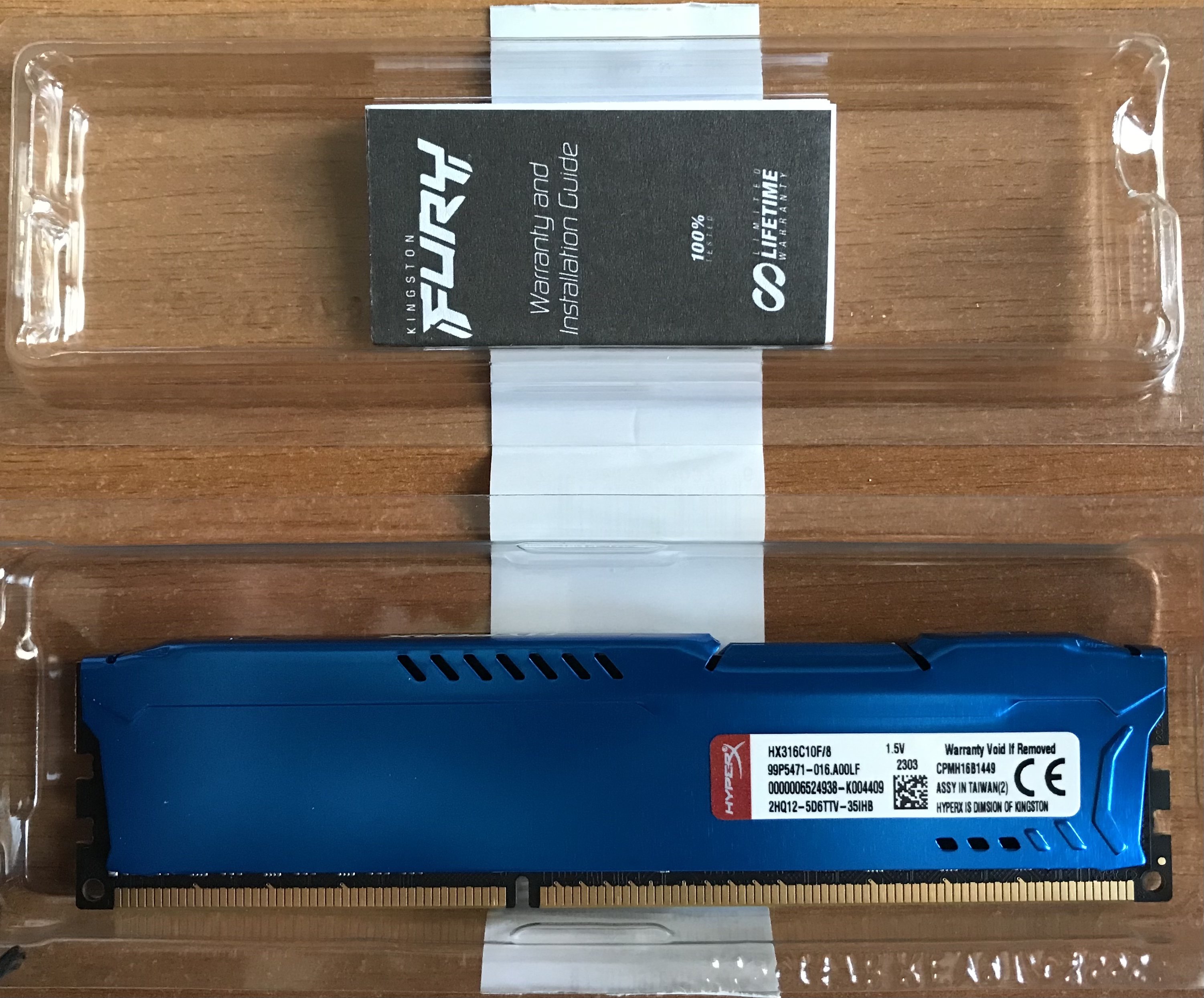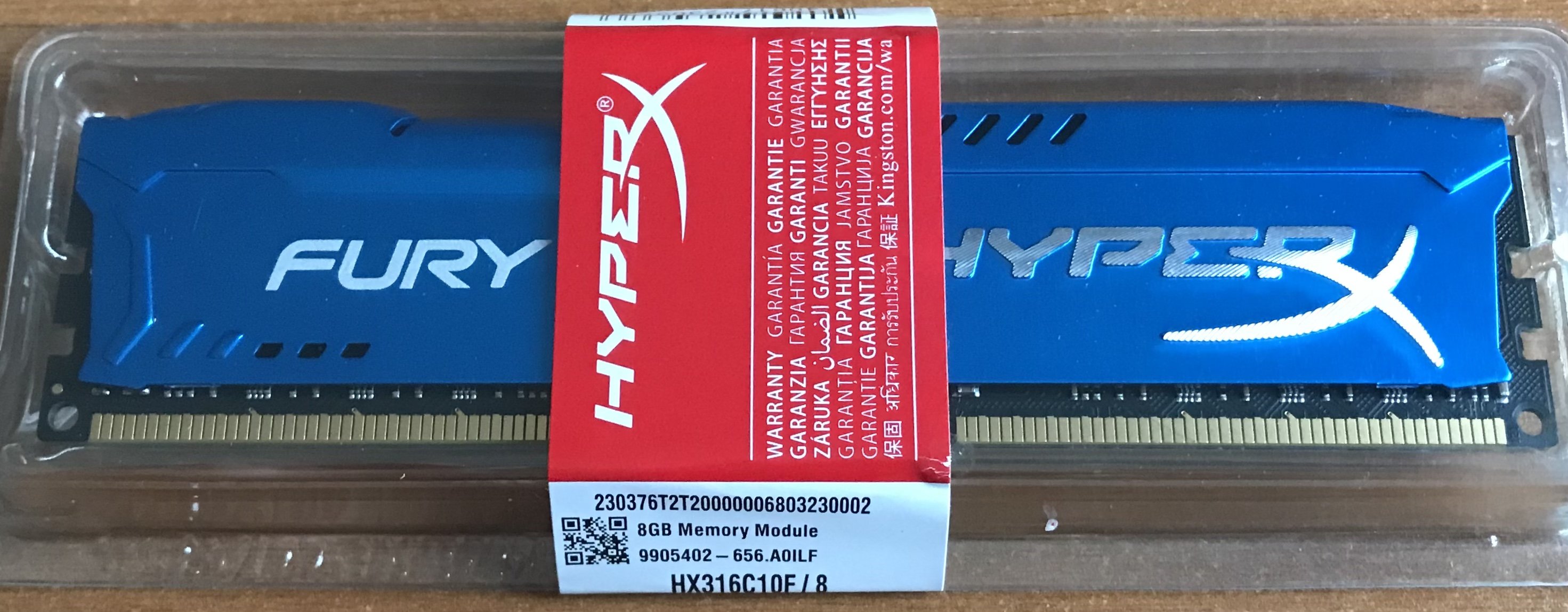Arrivato oggi il banco di memoria per l’i5, la prima impressione è che potrebbe essere una imitazione, cioè una normale RAM con la cover Fury HyperX, in questo caso blu, ma volendo avrei potuto scegliere altri colori, nero rosso bianco, comunque spero che non crei problemi e venga letto ?, senza per forza che sia identico, in breve è 8GB DDR3 12800 CL10 240-PIN, e se è vero quanto ho trascritto, dovrebbe corrispondere all’altro modulo (originale Kingston), quindi con questo secondo modulo, dovrei passare a 16GB totali, e soprattutto al dual channel, quest’ultimo dovrebbe dare un incremento nelle prestazioni della memoria, di quanto non ho idea ?, ma c’è il bench di Win8, che potrebbe dare un valore maggiore del circa 7.5 attuale, magari ? chissà se si possa avvicinare a 9.0, non credo lo superi, però non posso neanche escluderlo.