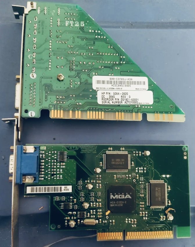Torno brevemente su un paio di schede per PC, abbastanza old, personalmente non ne ho avute uguali (in realtà ne ho altre abbastanza simili), la prima delle due è una AGP Matrox, sembra essere una G100, un modello molto datato e meno comune rispetto ? alle G200 o G400 (successive), purtroppo ? non può essere usata su schede madri successive, forse ? al massimo su quelle con AGP 4X???, sicuramente su quelle con AGP 2X, roba del periodo del Celeron Mendocino o PII Slot1, insomma dato che ho vari modelli di VGA Matrox, questa mi mancava, spero ? ovviamente ? che vada bene ? e funzioni.