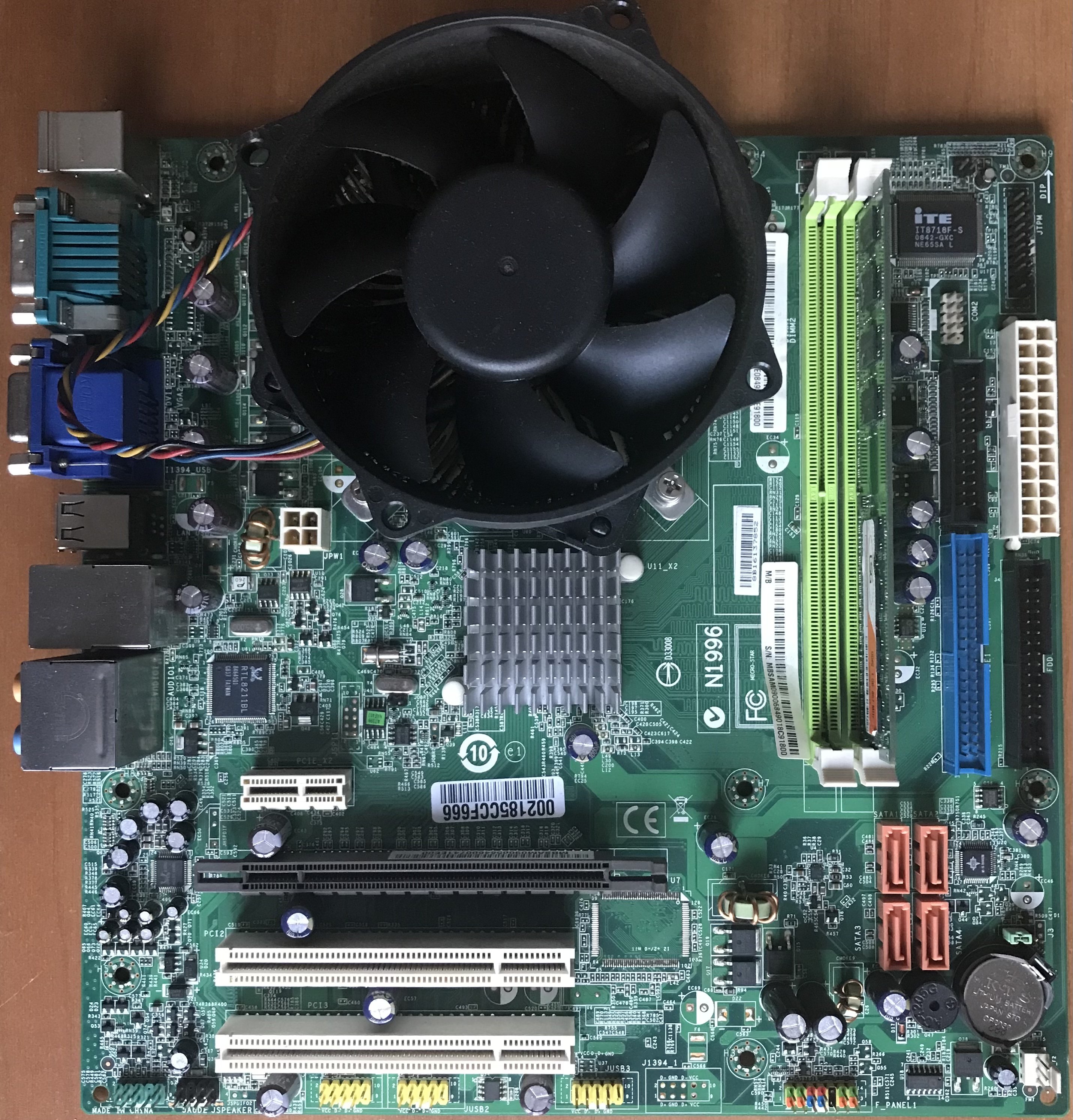 L’altra scheda, è la MSI (Micro Star), non riporta alcun modello (stranamente), in questa ho cambiato tutti e cinque i condensatori vicino la RAM, anche se uno ☝️ era in buone condizioni, il resto (cioè quattro) invece era ko, e probabilmente impediva il corretto funzionamento della scheda, li ho sostituiti con dei (Nippon?) KY 1000uF 6.3V, perché nella scheda c’è ne sono altri simili, quindi anche qui adesso, si può provare l’avvio, ha già tutto il necessario il video integrato la CPU e la RAM, aveva già una DDR2 667 da 1GB.