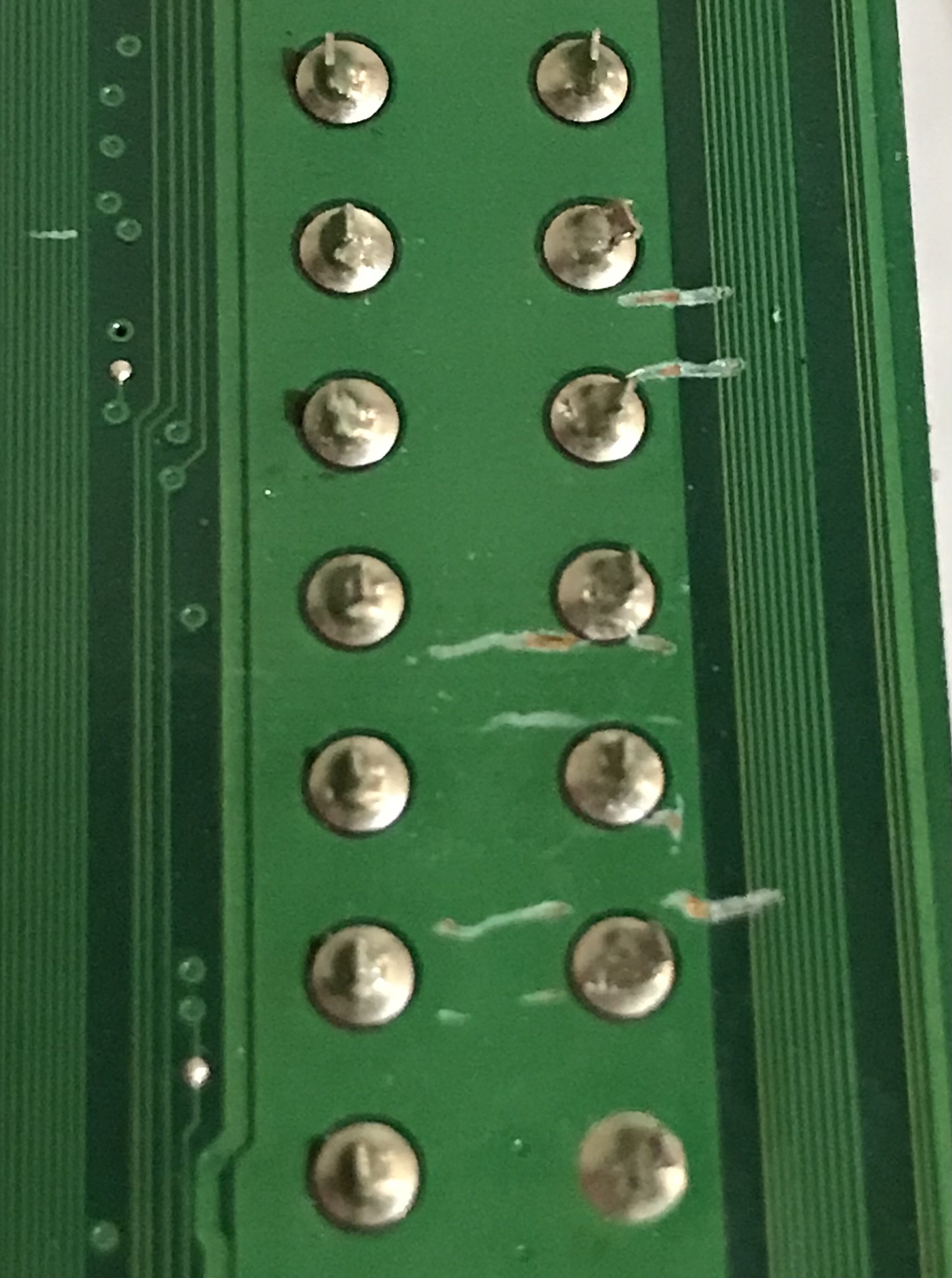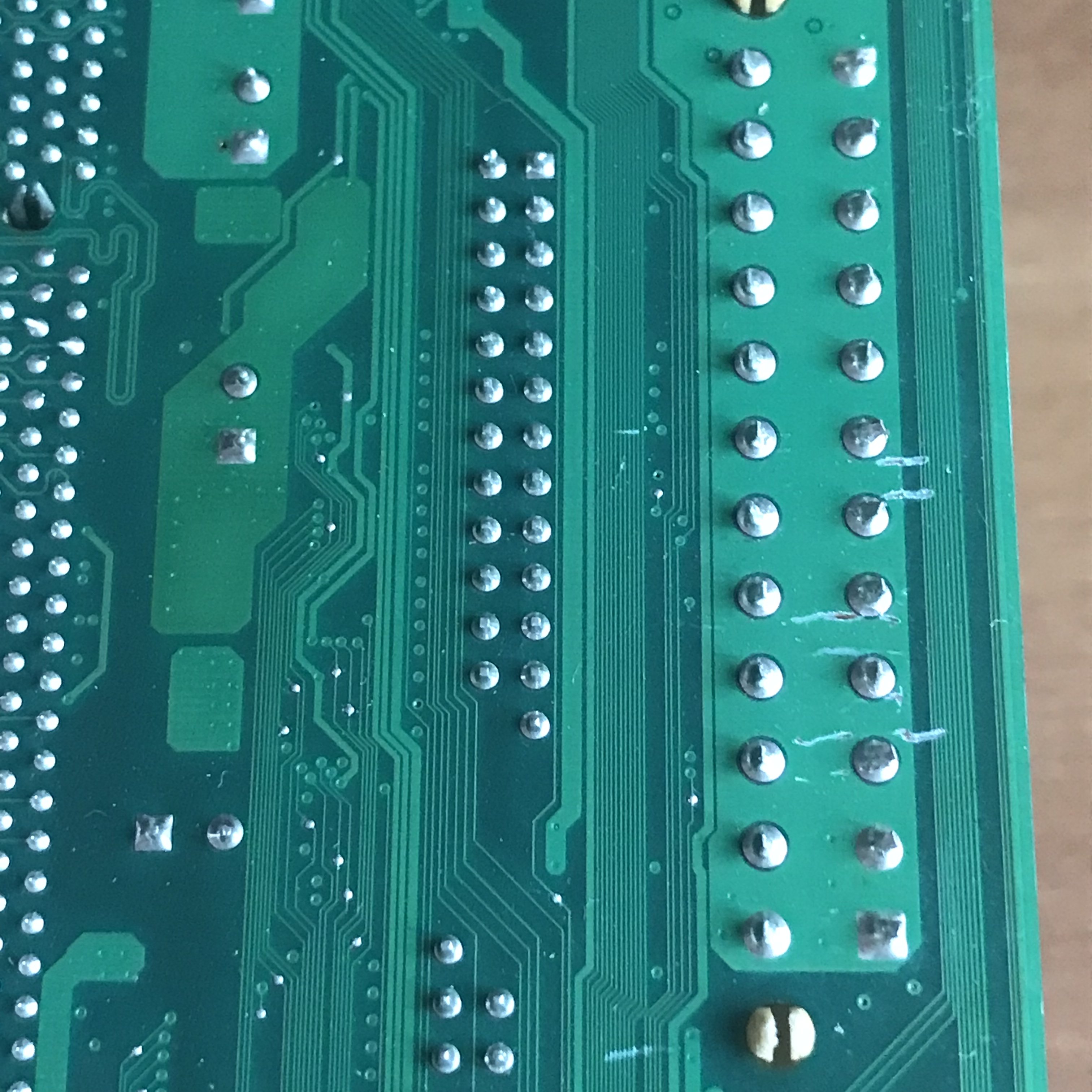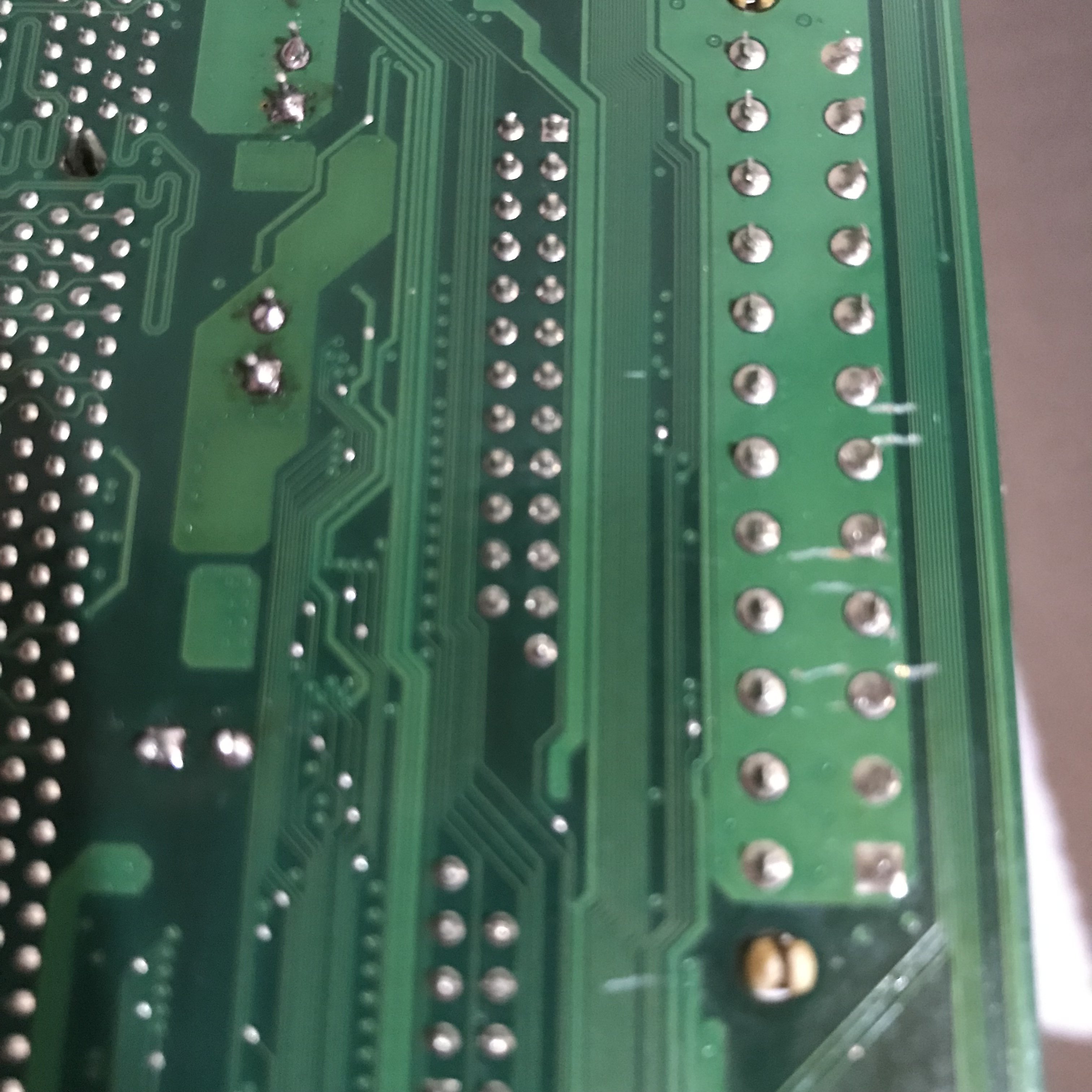 Decido quindi di provare la scheda MSI, ma faccio un controllo preventivo, intanto non so come collegare lo switch per l’avvio, devo cercare se lo trovo da qualche parte, comunque ingrandisco la zona del retro in corrispondenza della presa ATX1, e qui trovo che tutti e tre i graffi hanno interrotto le sottili piste, ho cercato di fare delle foto, ma non riesco a far meglio, purtroppo ? prima di fare un tentativo di avvio, occorre sistemarle, e per il momento preferisco fare altri lavori di sostituzione componenti (non per forza condensatori), pazienza vedremo in futuro se magari ? con un po’ di tempo ⏱ libero, riesco a sistemarle.