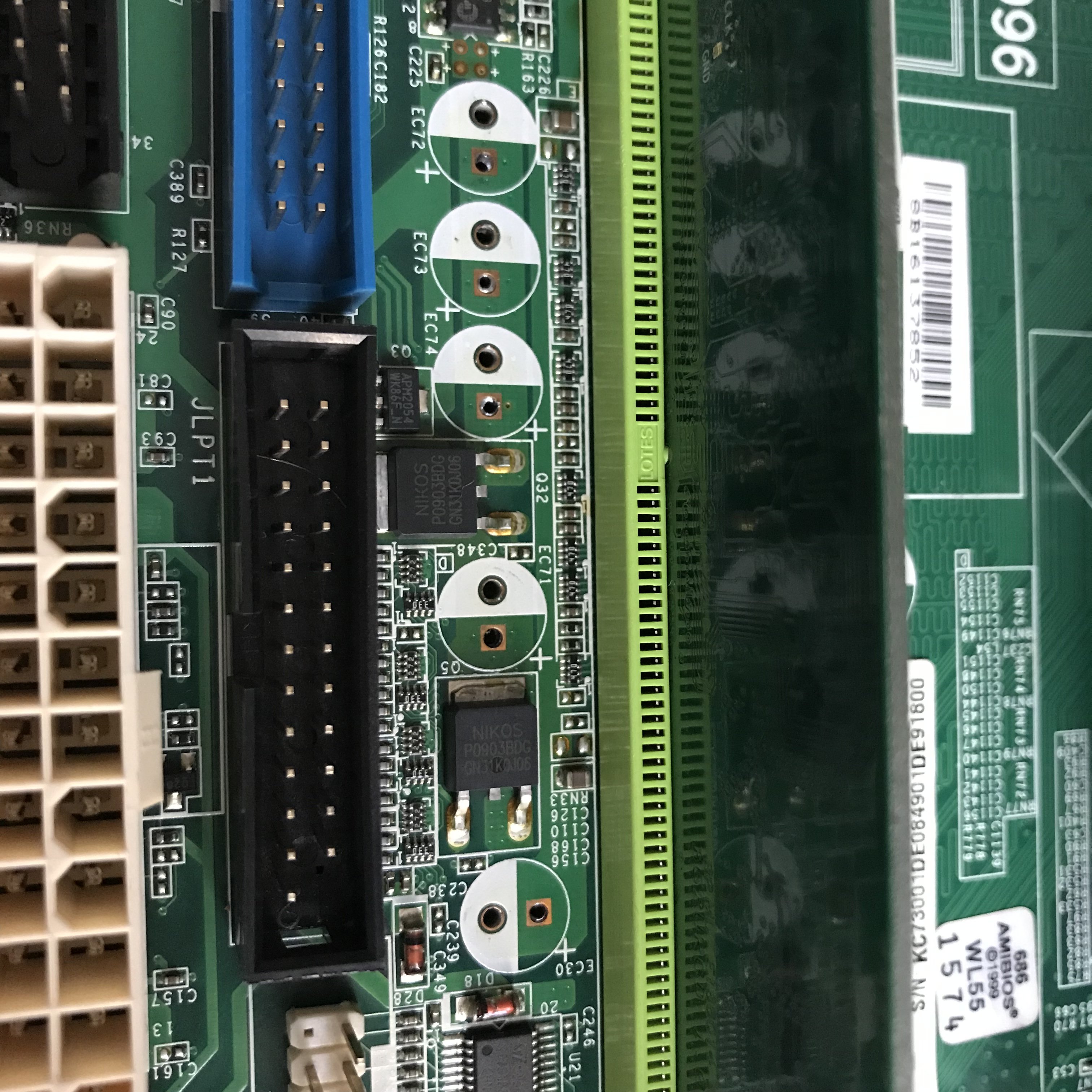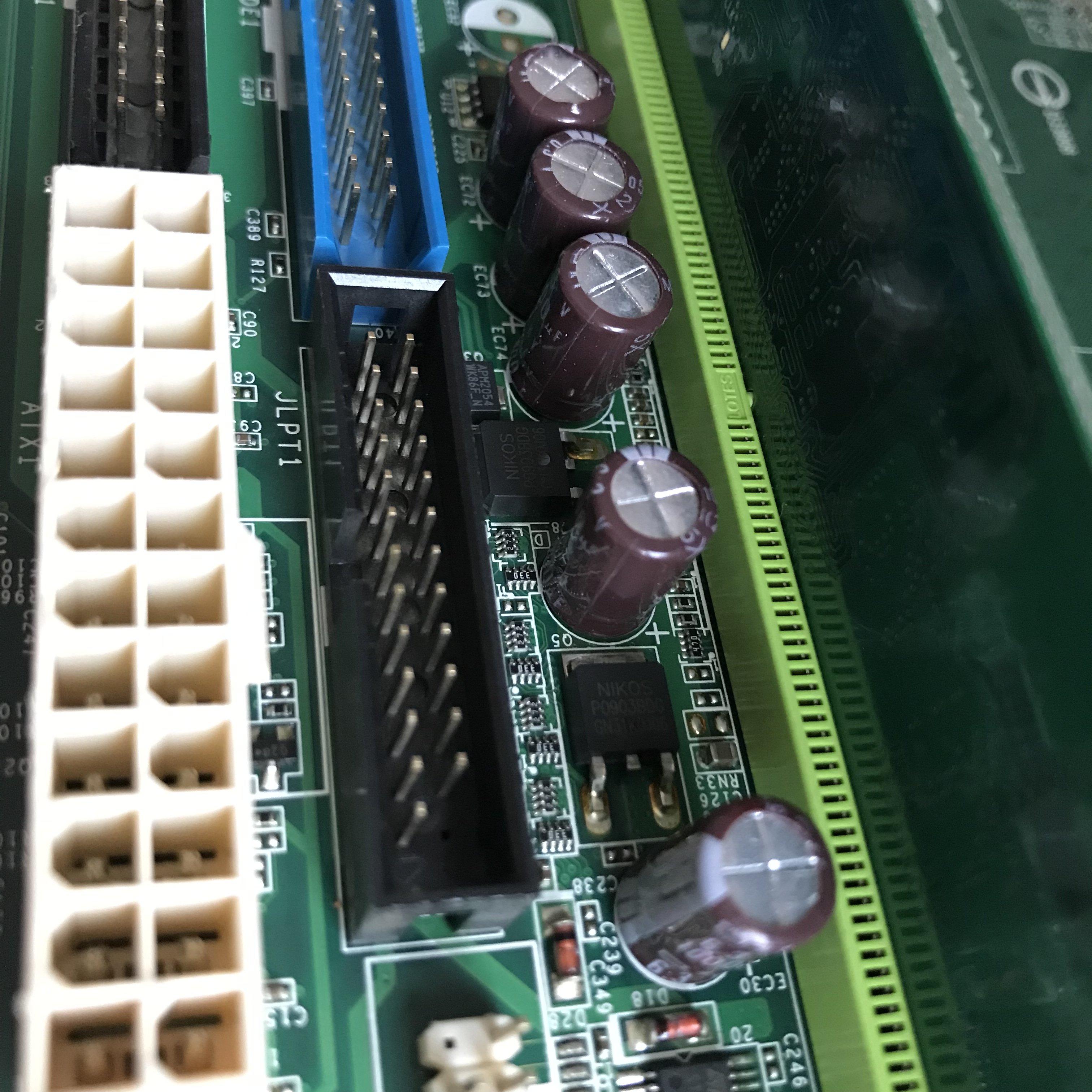 L’ultima scheda è una MSI, il modello non è riportato, forse ? è una scheda prodotta per Acer (?), tutto abbastanza in ordine, a parte i condensatori lato RAM da cambiare, sono degli OST 1000uF 6.3V, uno ☝️ dei cinque visibilmente sembra nuovo, ma lo cambio ugualmente, poi non è detto che verificandolo emerga qualche problema, purtroppo ? nel retro vicino al connettore di Alimentazione, ci sono un paio di graffi, potrebbero essere solo superficiali, ma andrebbero verificati, spero ? non ci sia alcuna pista interrotta, però in caso con molta pazienza, si potrebbero sistemare, anche se al momento non ho voglia di fare questi lavori.