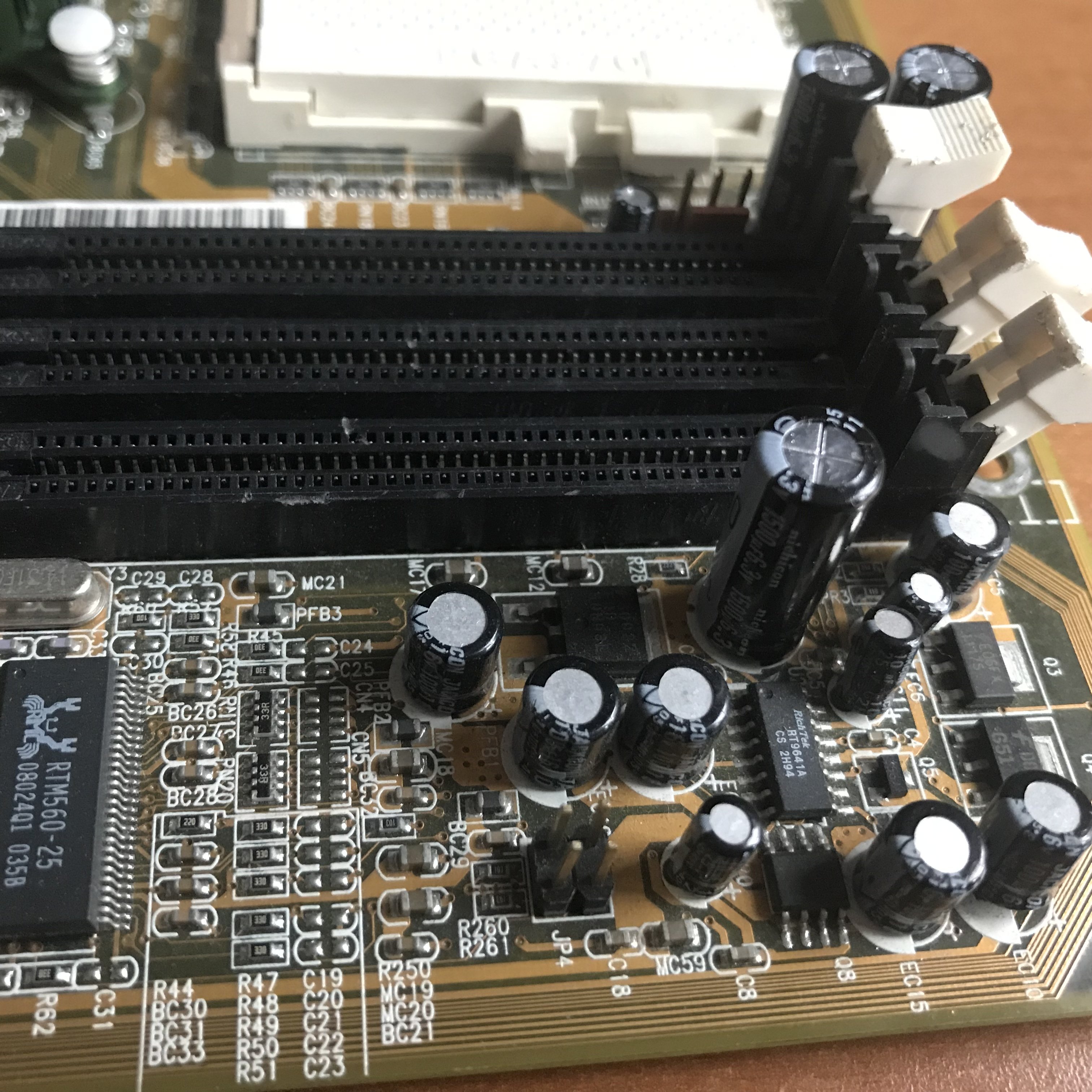 Al posto degli originali (abbastanza scadenti), ho messo dei Nikicon 1500uF 6.3V, e sono come dimensioni abbastanza simili, il lavoro di saldatura è stato relativamente semplice, anche se alcune non sono venute proprio bene ?, l’importante è che la scheda dopo questo lavoro, torni funzionante, non so quando ma farò una prova, aggiungendo RAM e CPU (più una batteria ?), non occorre altro, perché c’è il video integrato, oltre all’audio, anche se quest’ultimo non è essenziale per fare un test di avvio