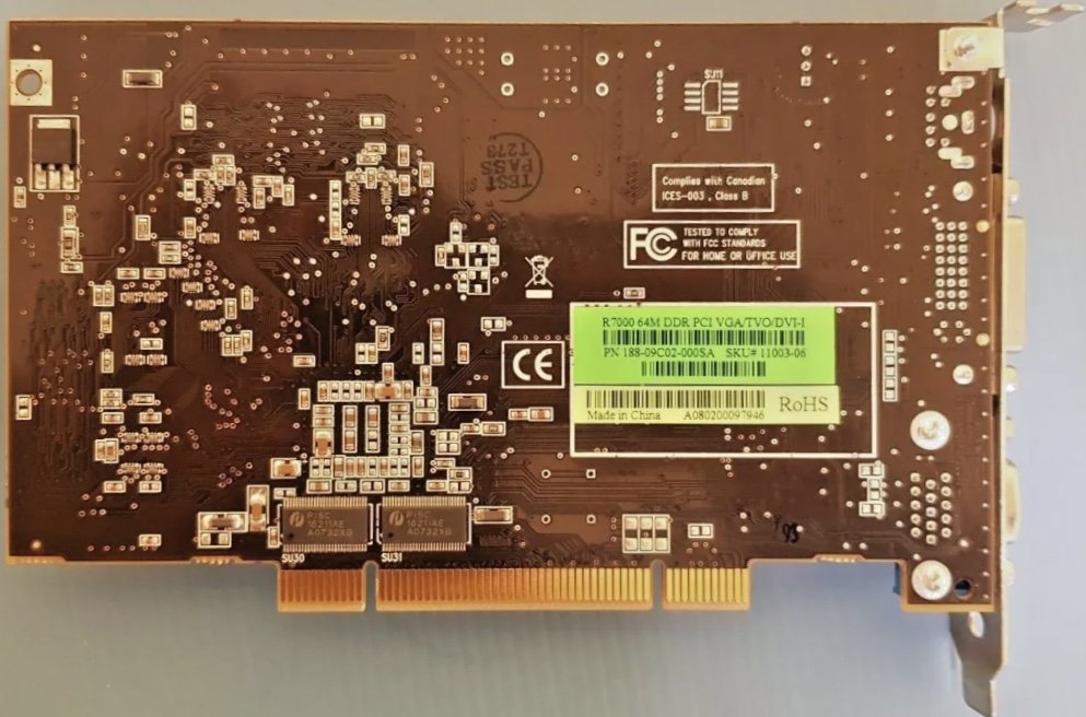 Infine, oggi dovrei fare un lavoretto sulla ATi R7000 PCI da 64MB, avevo notato subito la mancanza di un condensatore SMD, ma di recente nel retro ho visto ? che mancava anche un SMD (non identificabile), così dopo una breve ricerca ? ho visto da una immagine, cosa ? fosse, dovrebbe trattarsi di un condensatore minuscolo di colore marrone, come gli altri vicino.