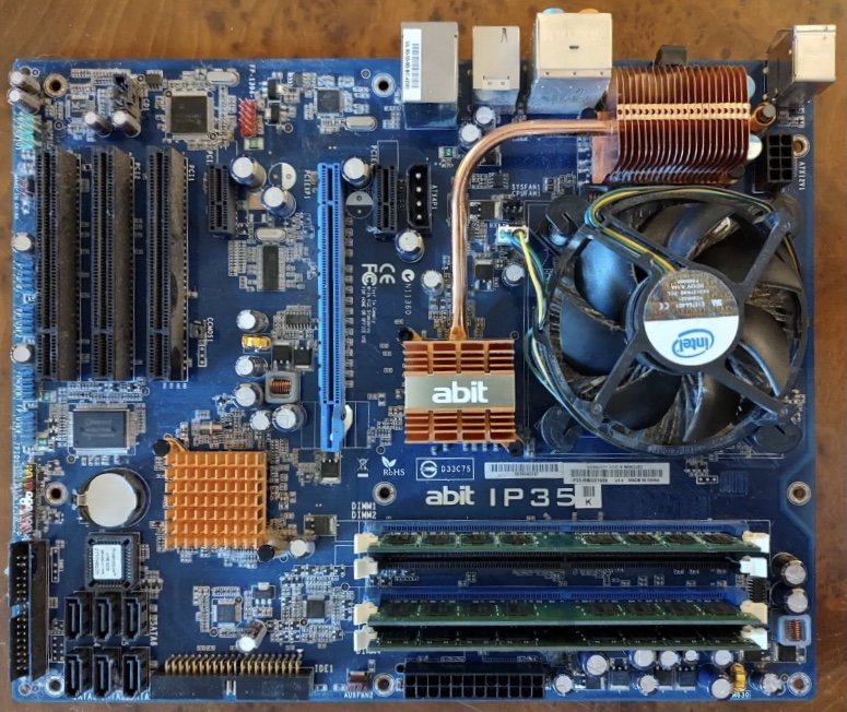 MB ABIT IP35 (di un bel blu), CPU Pentium Dual Core E4600 (dovrebbe essere 2M 800 2.4GHz, se non ricordo male), 6GB di RAM DDR2 (3X2), cooler fan Intel, il formato della MB dovrebbe essere ATX, e sono presenti tre slot PCI e uno