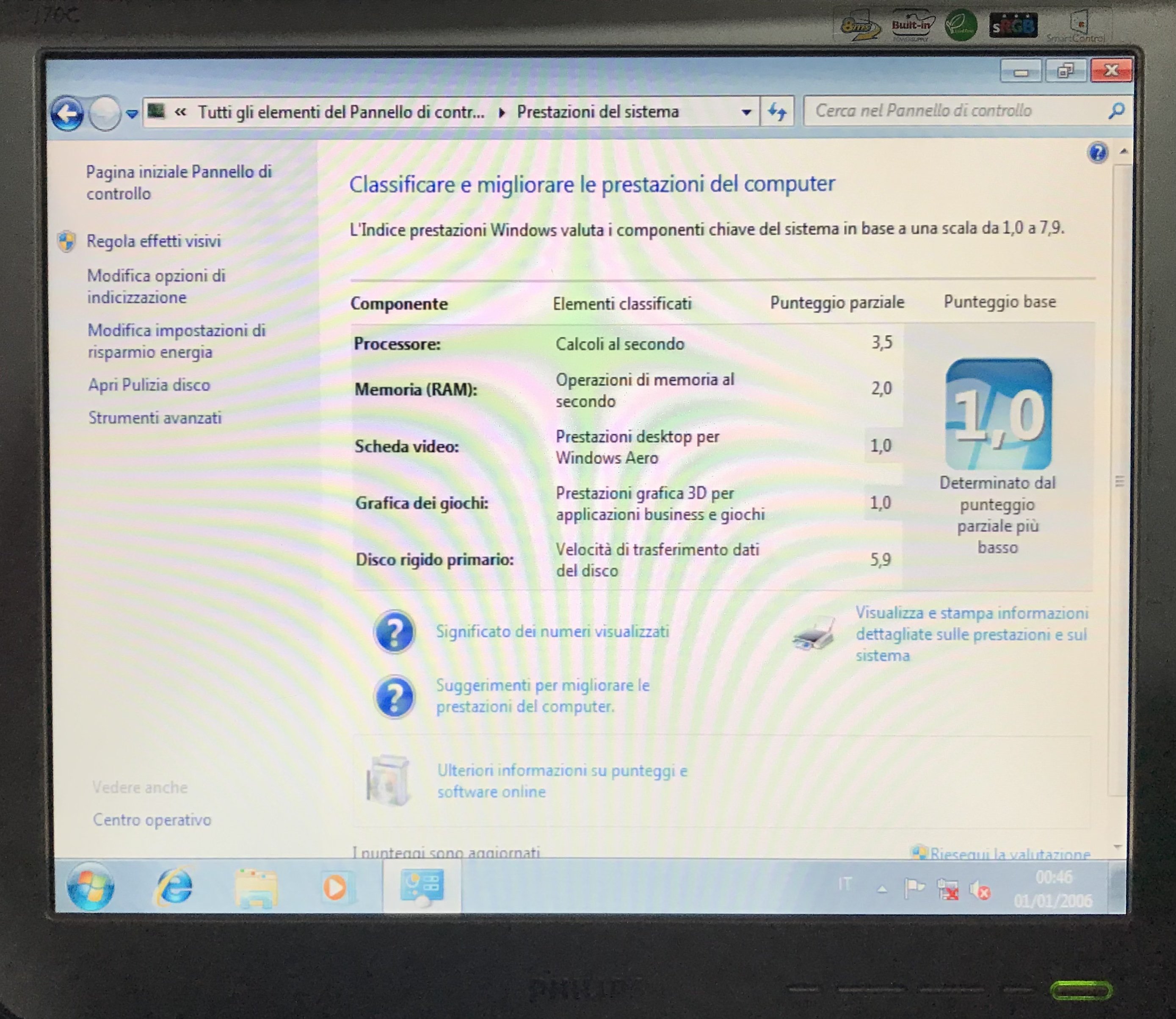 La prima cosa che ho fatto, è la classificazione del PC, ero curioso ? di vedere i punteggi, come immaginavo il migliore è il disco, con 5.9, che penso sia buono per un HD meccanico tradizionale, secondo punteggio più alto (ma abbastanza basso) è quello della CPU 3.5, qui urge upgrade se si vuole ottenere almeno 4.5-5.5, e ovviamente ? occorre un dual core, la RAM ottiene un misero 2.0, questo si può migliorare facilmente, cambiando i moduli con altri più grossi, già con 2 GB ?? si dovrebbe stare sul 4.0-5.0 circa, scheda video e 3D, invece come immaginavo ottengono solo 1.0, che poi è il punteggio assegnato al PC, sicuramente migliorabile, ma solo a condizione di mettere una VGA AGP di un certo livello.
