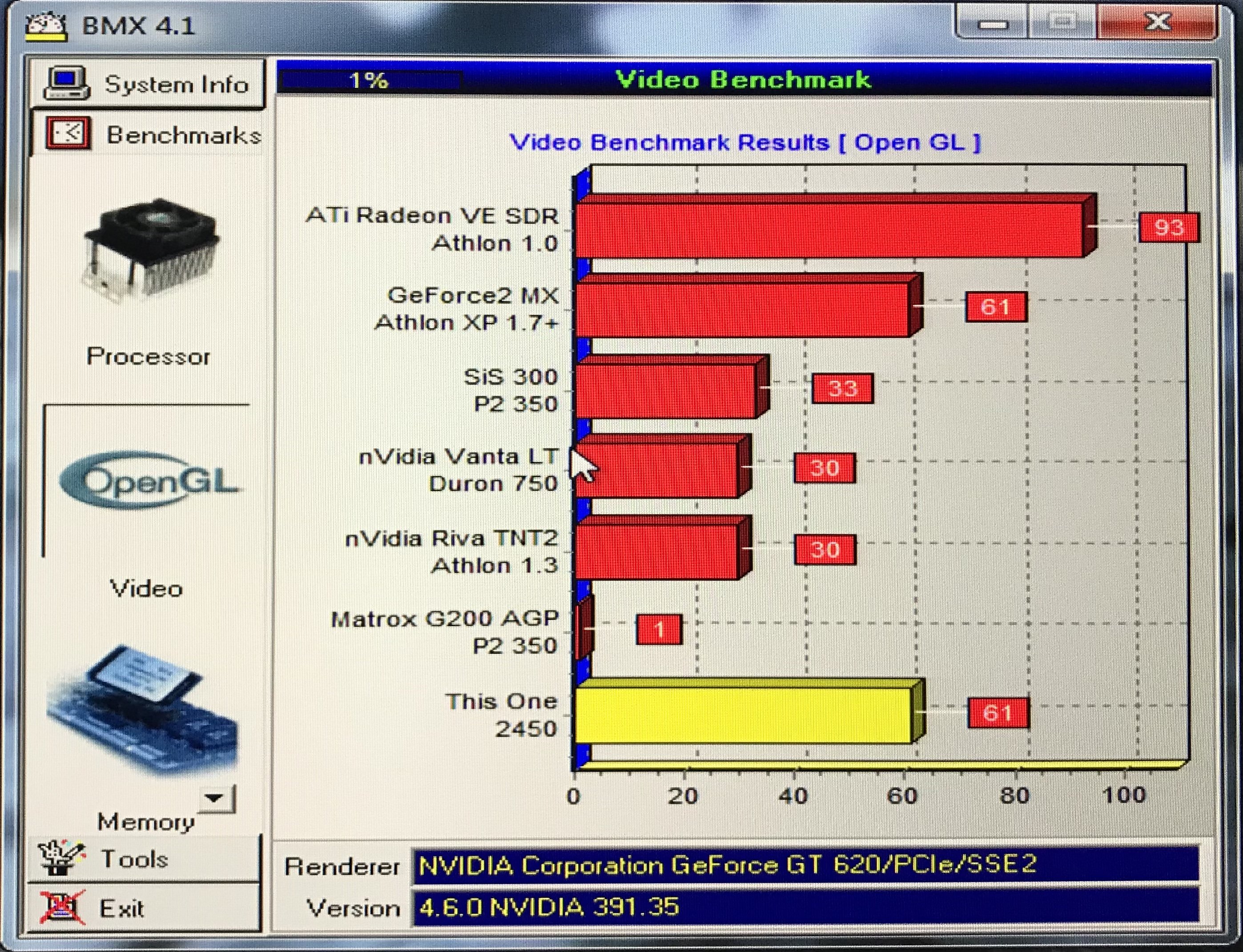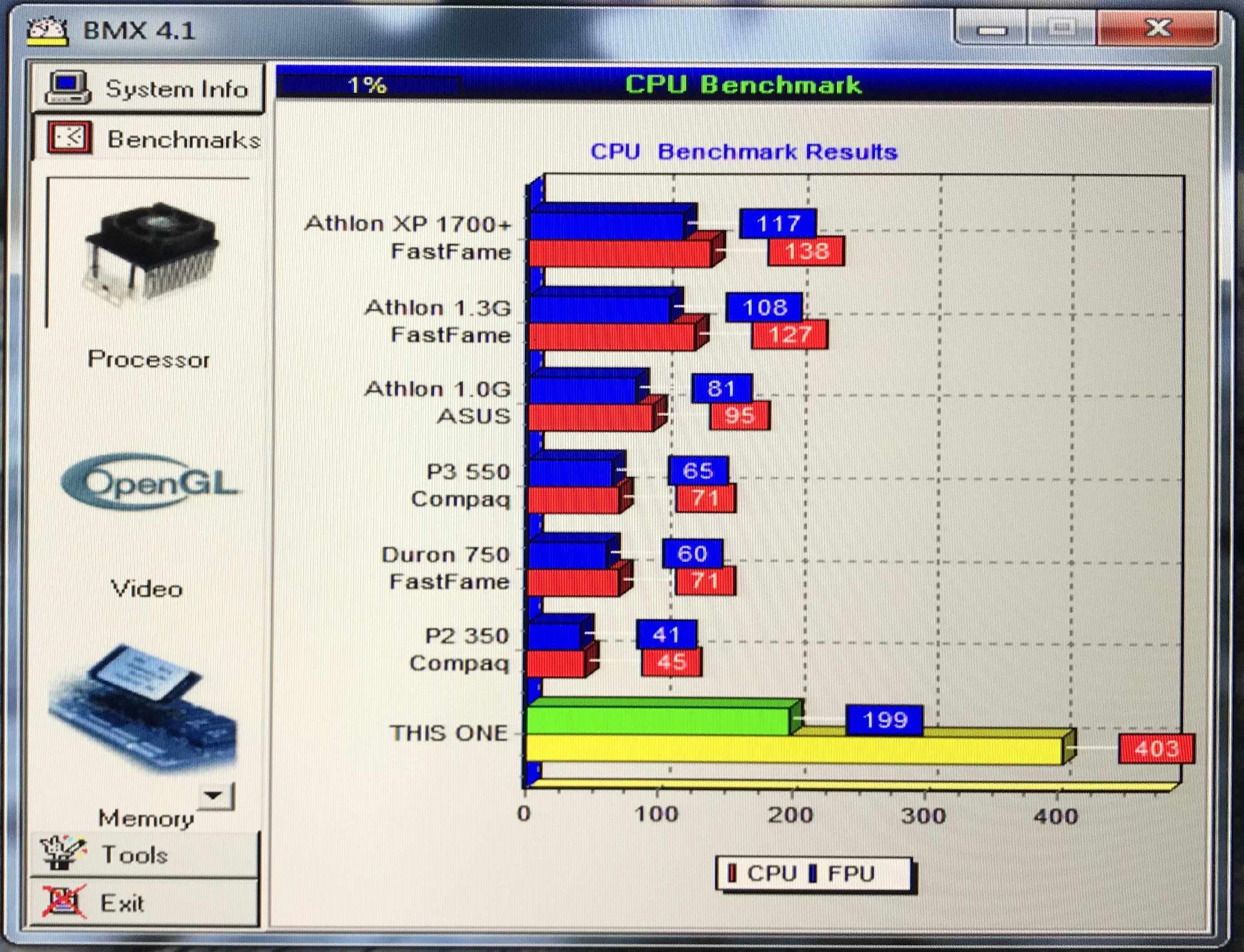 Tra i programmi di bench datati, che avevo a disposizione c’è BMX, purtroppo ? con Windows 7 o con PC veloci, va in crash e non è possibile usarlo, ma poco fa ho cambiato l’impostazione in cui puoi scegliere che SO usare per avviarlo, ho scelto W98, e ho riprovato, ebbene da lo stesso errore e va in crash, però a differenza delle altre volte in cui si chiudeva, stavolta è rimasto aperto e pronto all’uso.