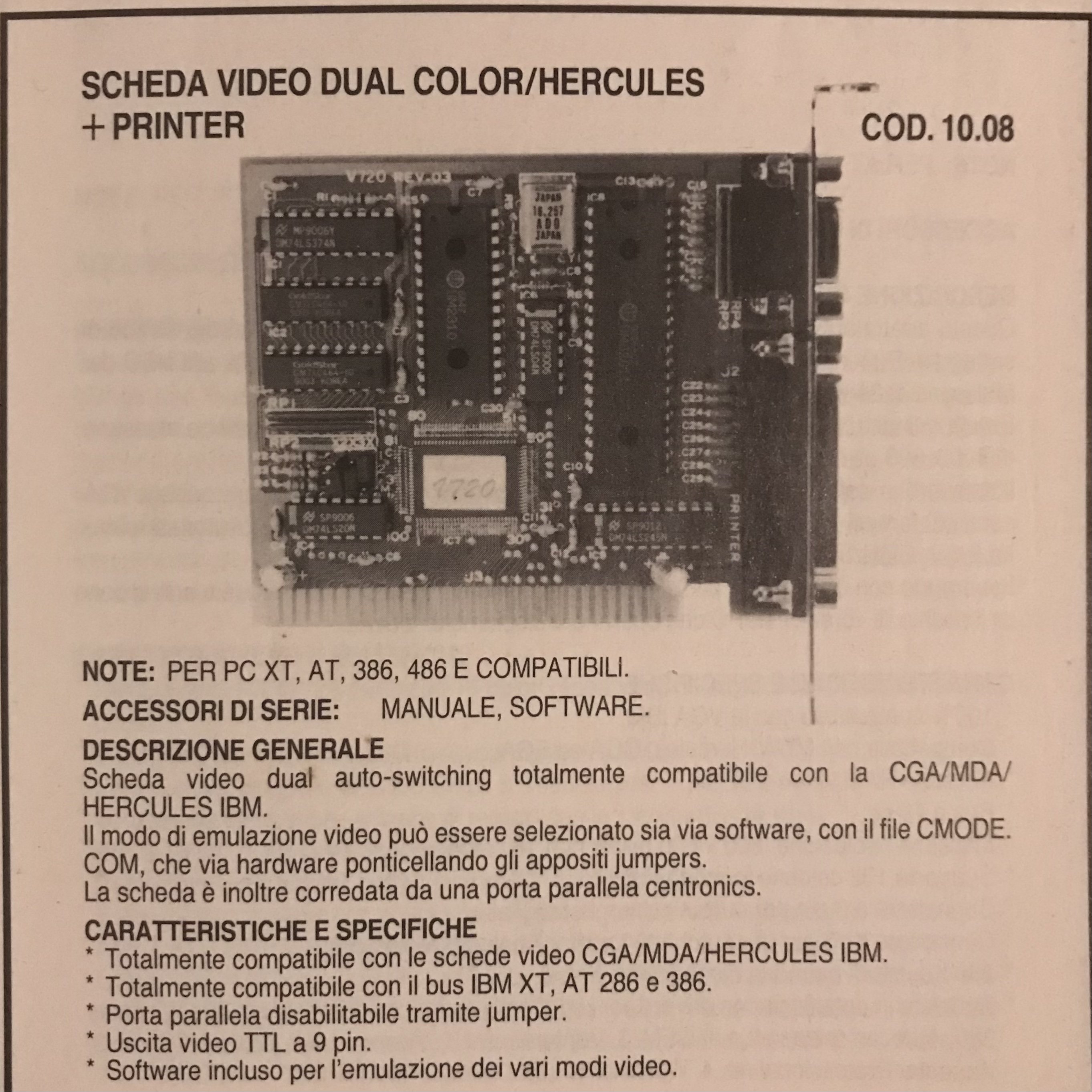 Oltre quello ho un vecchio catalogo HW, in cui spiega abbastanza dettagliatamente le caratteristiche HW di una scheda, e inoltre c’è una descrizione altrettanto dettagliata, in questo catalogo invece la scheda è una Color/Hercules, e ha un modulo aggiuntivo PAL Optical, che può collegare una TV Color (PAL).