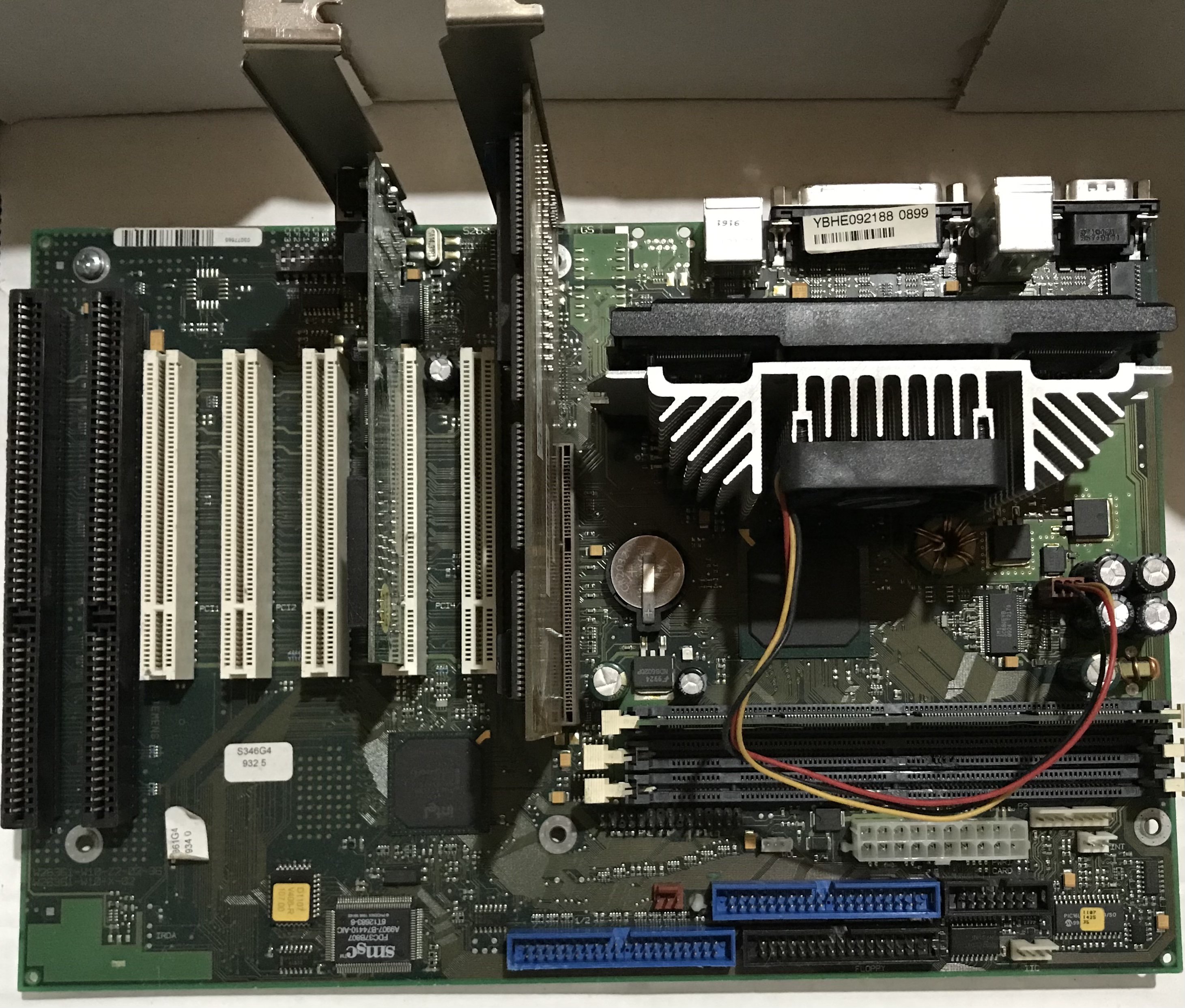 Ho una Siemens Slot1 con P2 350, chipset BX, scheda video Trident 9750 da 4MB, inutile dire che è parecchio datata come VGA, ma per il momento può restare la Trident, anche perché ha due slot RAM un po’ danneggiati, e uso solo un banco dei tre, in cui ho messo una RAM da 128MB.