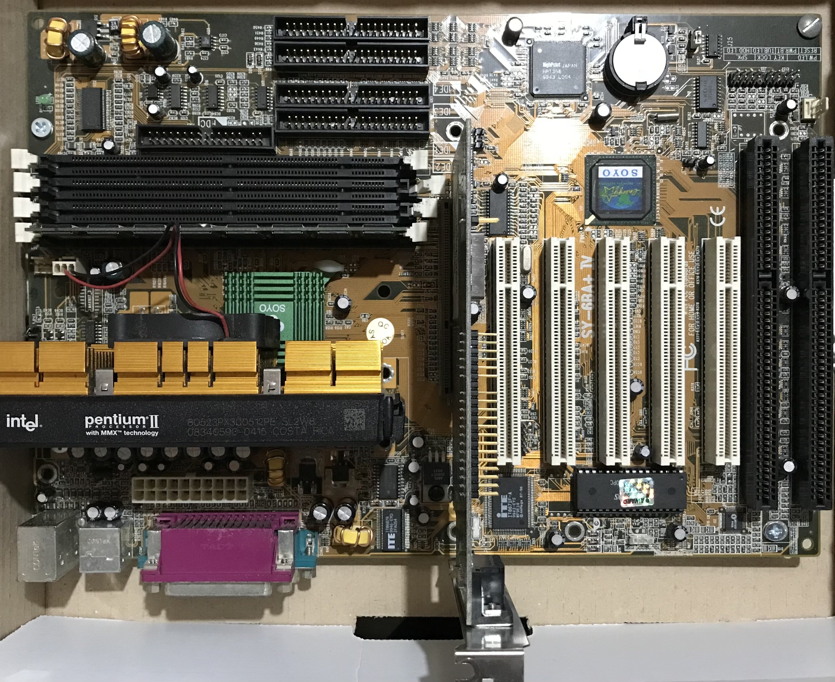 Un’altra scheda simile, ma più evoluta, è la Soyo SY-6BA+IV, con un P2 300, tra parentesi sembra che si possa overclockare a 450, come i Celeron, ma questo non so se sia possibile? Attualmente c’è una VGA ATi Rage Pro Turbo, forse da 4MB, andrebbe aggiunta una scheda audio, e qualche RAM, volendo si potrebbe espandere fino ad 1GB, ma non so forse 512MB sarebbero anche tanti?
