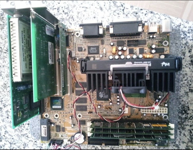Volevo provarla già stasera, ma ho notato che ci sono due condensatori elettrolitici rigonfi, vanno assolutamente sostituiti, forse ? insieme agli altri vicini, è un lavoro che si può fare, ma non credo a breve, a parte quello sembra come nuova, direi in ottime condizioni, la CPU è un PII 266 MHz, e ci sono tre RAM, credo da 64 MB ciascuno, almeno per il momento è tutto.