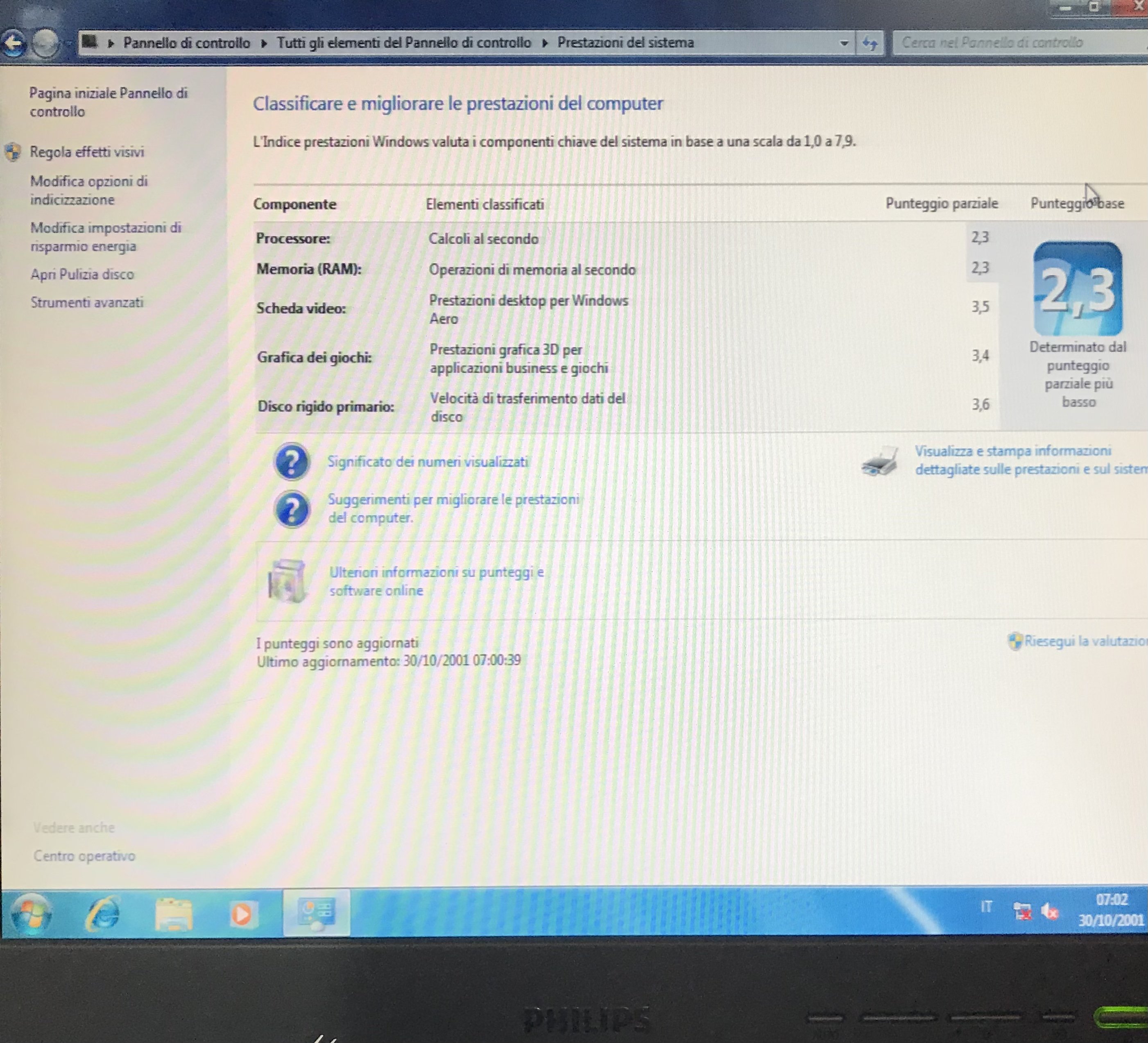 Aggiornamento sul P4 Willy 1700, con RAM di 1.5 GB ?? (3X 512), e Windows 7 nel disco WD da 30.7 GB ??, VGA AGP ATI 9550 da 256 MB, scheda madre ECS P4IBAS 478, questa adesso è una configurazione quasi definitiva, mi resta da sostituire il cavo HD con quello da 80, e provare a vedere se ottengo qualche miglioramento, nel punteggio del disco.
