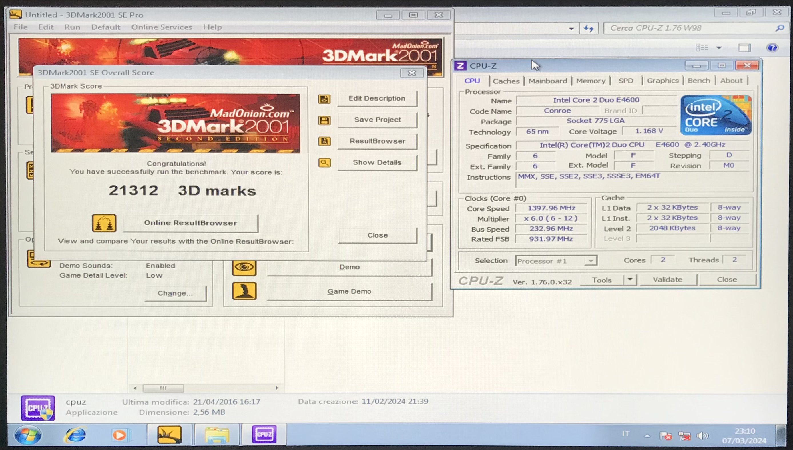Ho fatto solo il bench di CPU-Z Ver.2.X, in seguito farò quello della Ver per W98, poi ho rieseguito la valutazione del indice di prestazioni di Windows 7, c’è un aumento di 0.3 sia per la CPU che per le RAM, non è moltissimo ma salendo a 3.2 GHz, potrebbe arrivare vicino a 6.5, che è il punteggio massimo che ottengo (Grafica dei giochi).