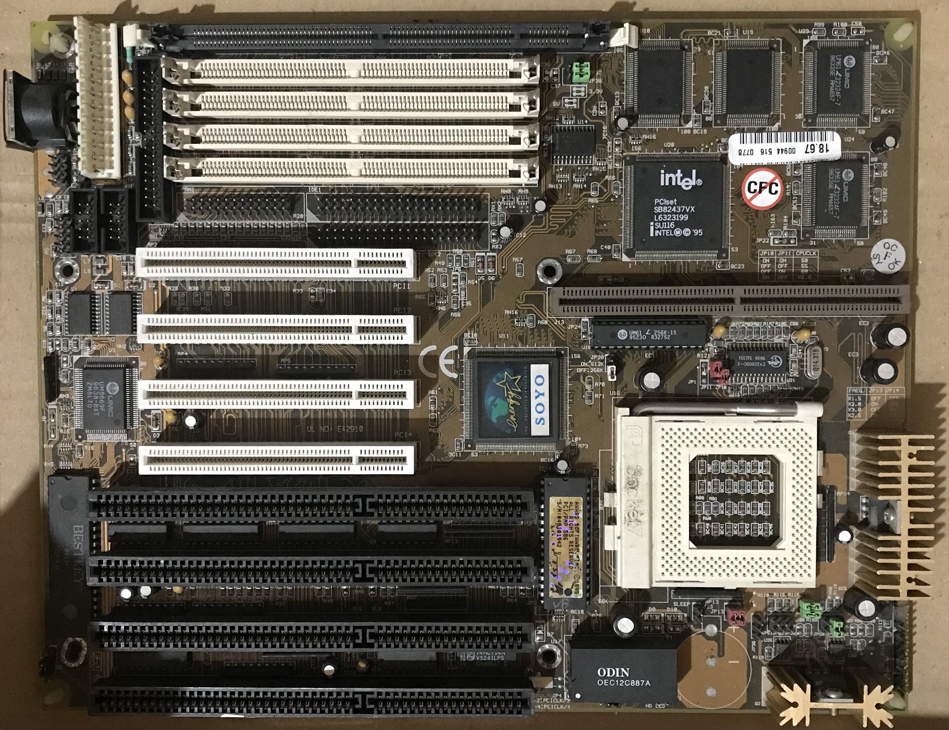 La SOYO è in formato AT (Baby), non ha VGA integrata, e il chipset è Intel VX, qui si può scegliere se usare le RAM a 72 PIN oppure quelle da 168 PIN (SDRAM), non credo sia possibile usarle insieme, ad ogni modo su questa userò direttamente le SDRAM, perché sono più facilmente reperibili, e hanno capienza superiore (di solito), resta da capire se vengano letti interamente i moduli di capacità superiore a 32 MB, in ogni caso già con due da 32 MB, avrei in totale ? 64 MB, quantitativo più che sufficiente per DOS e sufficiente per Windows 95 o 98. Qui i Chip cache ci sono, ed è presente anche la presa per il modulo aggiuntivo COAST, ovviamente ? avendo già una cache L2, aggiungerne altra non farà molta differenza di velocità (del sistema).