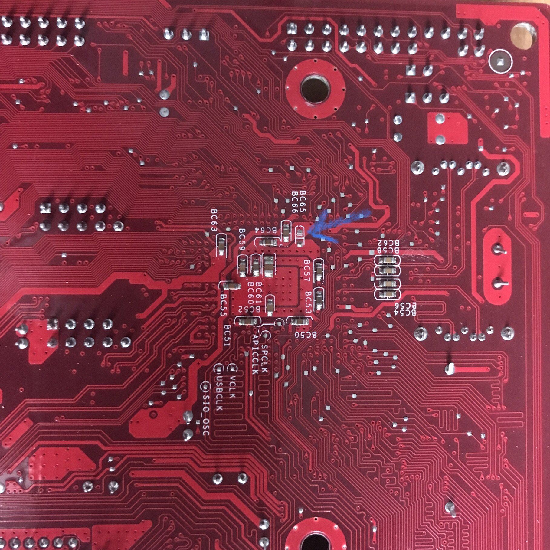 Oggi volevo provare la Pegatron, ed ho iniziato a radunare l’occorrente per l’avvio, ma da una attenta osservazione del retro, ho visto ? che manca un SMD, probabilmente immagino sia un condensatore, di dimensioni penso sia uguale a quello in verticale (stessa linea), cioè una dimensione media, lo capisco dalla distanza delle piste, non credo possa essere altro, e una certa simmetria me lo conferma, purtroppo ? non ho altre schede madri uguali.