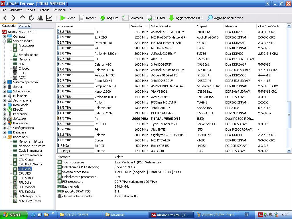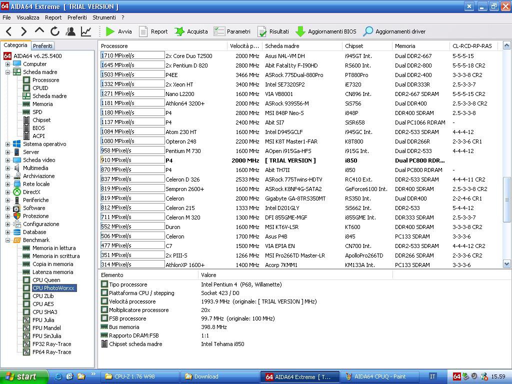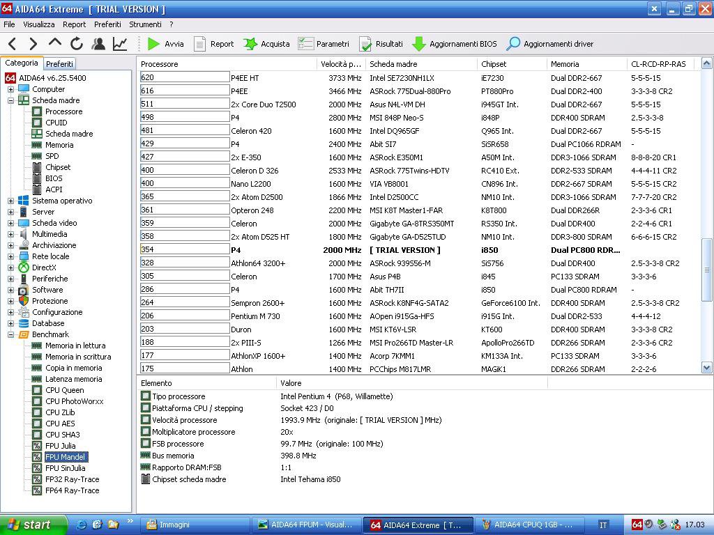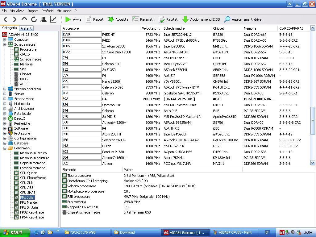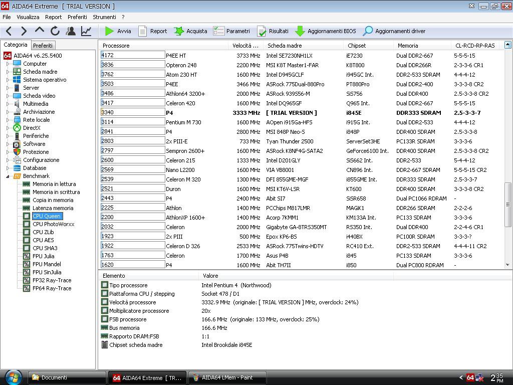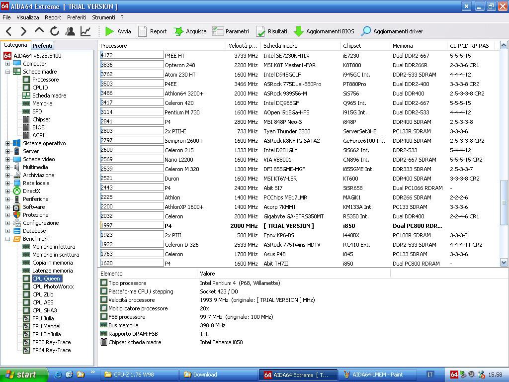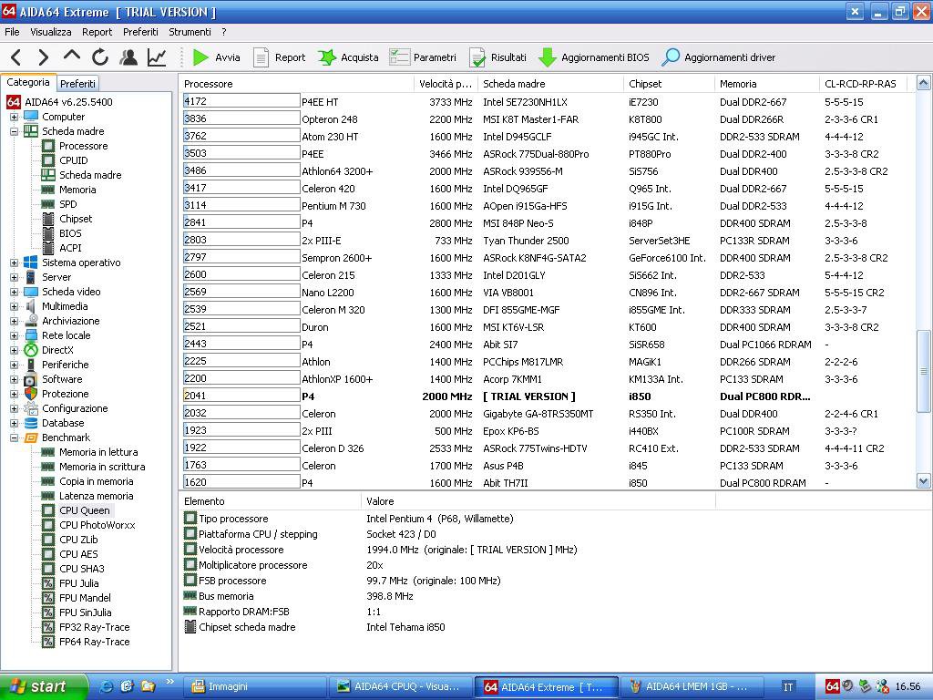 Ho scaricato nel PM questo programma di diagnostica del sistema, ver.6.25.5400 è una versione di valutazione (30gg), l'ho installato sul PC Internet e ho fatto i bench, all'interno dei bench c'è un elenco abbastanza completo di varie CPU dai socket 7 a CPU che al momento pochi possono permettersi, ma magari tra 10 anni chissà magari diventano accessibili. Metto le immagini, sono un po' tante ma se volete, la prossima volta metto un link e le immagini le metto da un'altra parte.