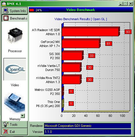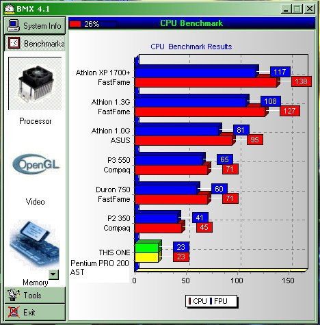 Nel PM ho riacceso il P.PRO 200:smitten:/emoticons/smitten.gif.e4e657d4a967ccd1c53e767628178b9a.gif" title=":smitten:" width="42" >, per vedere cosa avevo installato, qui ho Win98SE ma credo il SP sia l'ultimo ufficiale + directX9.0c, già che ero li ho installato bmx e HWiNFO32 per fare i bench, i risultati sono più o meno simili al VIA C3 600, trattandosi di poche immagini vedo di metterle qui.