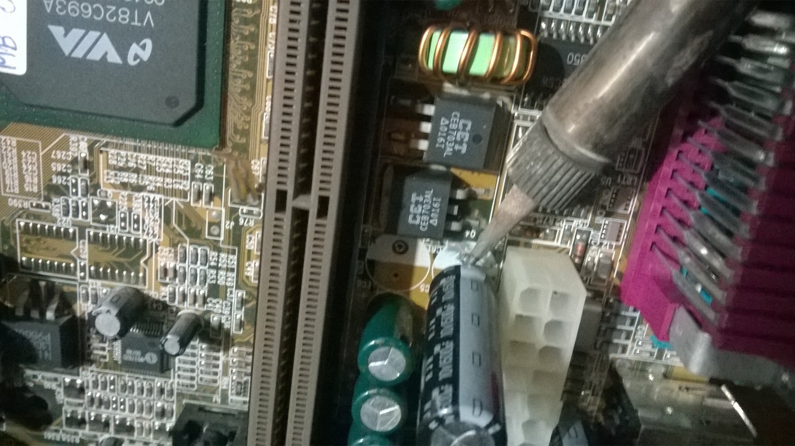 Scrivo della ASRock K7VT4A PRO, all'inizio mi ha fatto pensare che avesse un guasto da qualche parte, ma guardandola bene è quasi come nuova, controllo alcuni mosfet (quasi tutti) per vedere se c'è corrente, vedo che la tensione è presente e non ha valori strani.