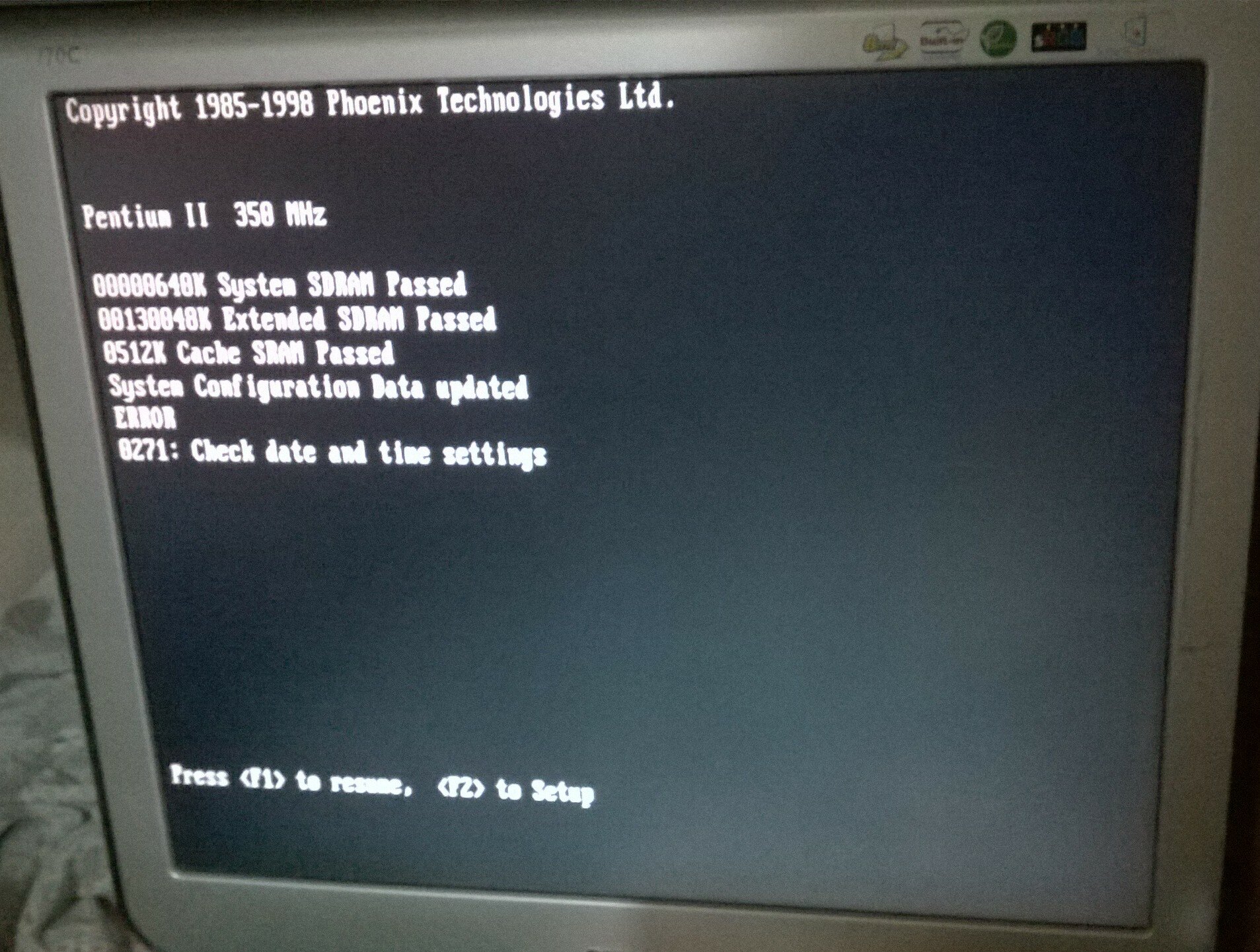 Purtroppo ha un chip RTC dallas con batteria scarica, bisogna fare il MoD., è un DS12887, non è tanto per la Batteria scarica ma per le info del BIOS che ad ogni avvio si perdono, inoltre c'è un baco al bios almeno per il momento non si entra premendo F1, premendolo il PC si blocca. L'unica cosa possibile è avviarlo da floppy. ma anche qui per il momento non va, forse è il lettore oppure i floppy che difettano, dovrei provarne altri sicuramente funzionanti e vedere che succede (cioè se parte).