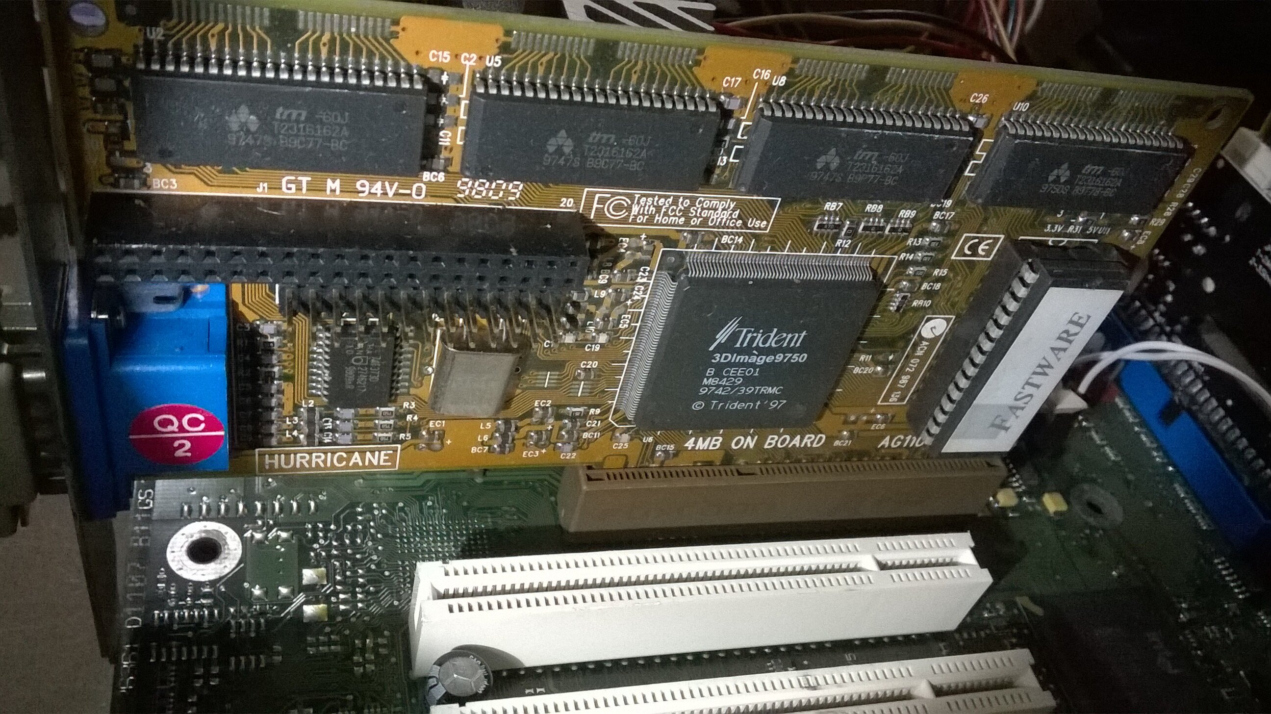 Ho radunato alcuni pezzi per testare la MB, un paio di alimentatori, due Cpu Slot1 Pentium II 300 e 350, una VGA AGP Fastware Hurricane con chip trident 3DI9750 da 4mb, una RAM pc100 da 64MB con quattro chip Hyundai, e infine la POST CARD ISA-PCI e uno swtich per il power-on.