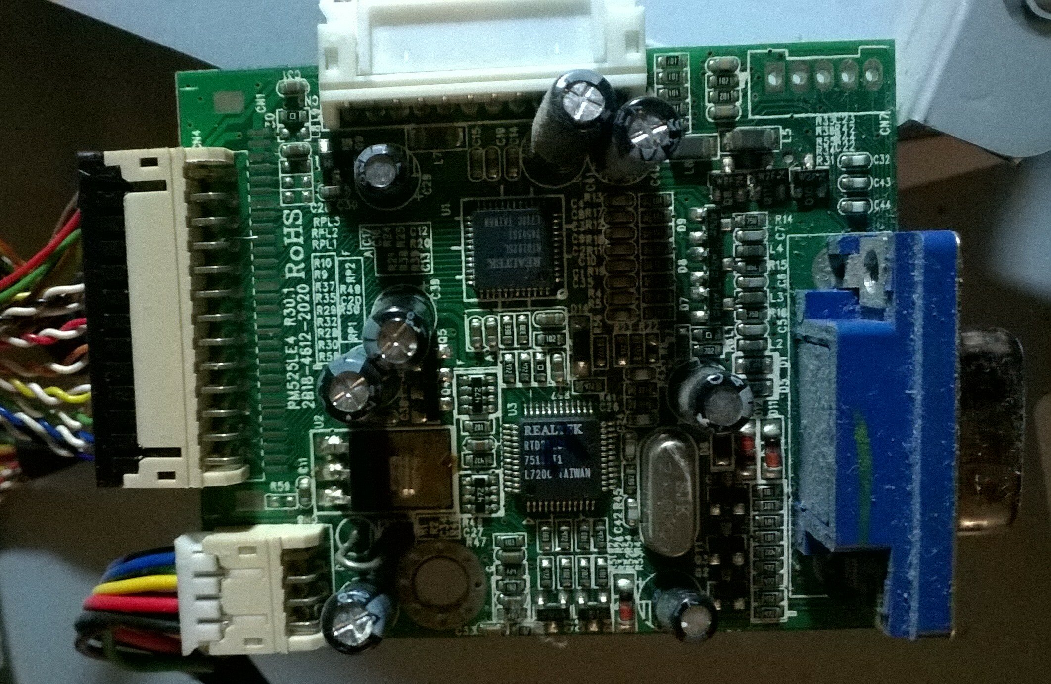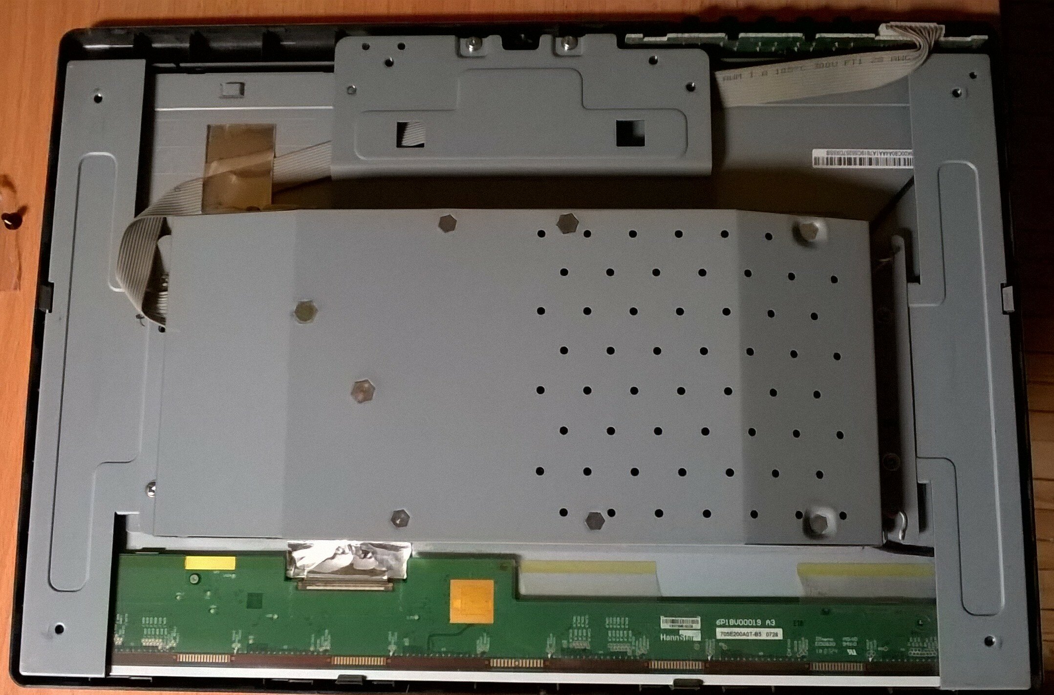 Riesco nello smontaggio senza rovinare o rompere la cornice, la scheda si trova all'interno di una scatola metallica, smonto le quattro viti che la fissano, e la scheda di alimentazione può essere rimossa smontando altre sei viti, e staccando i connettori della retroilluminazione e uno con quattro fili siglati +12V GND +5V ADJ, bisogna smontare altre due viti che fissano la porta VGA alla sctaola metallica, e finalmente la scheda viene via.