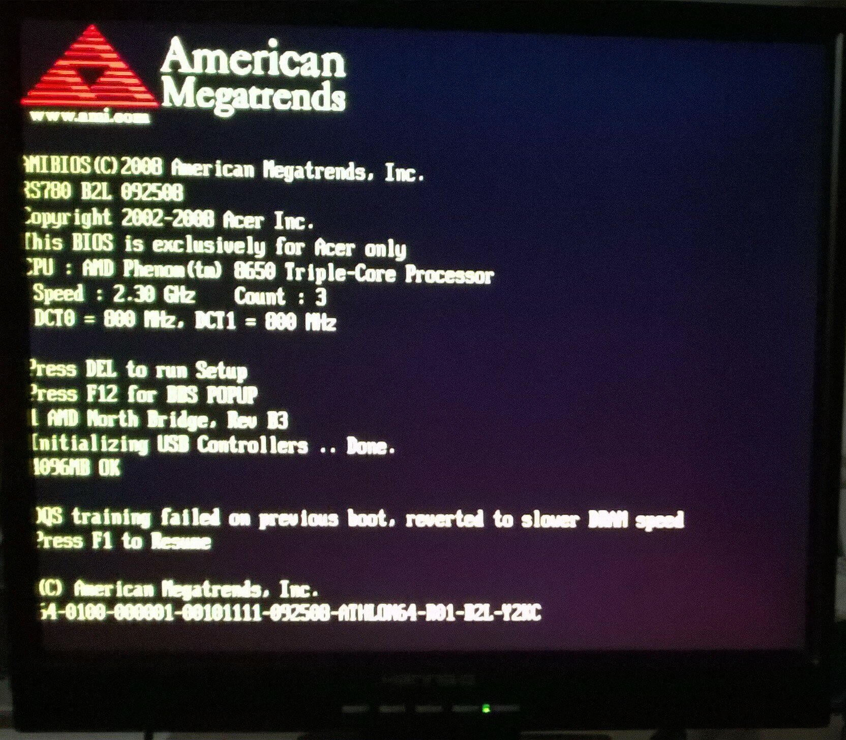 Tornando brevemente al monitor HannsG, oggi ho fatto un test collegandolo al New PC IN (Phenom), tutto è andato come pensavo, è tornato a funzionare, ma ad un certo punto il PC si spegne o riavvia, comunque il problema deve essere nel PC, visto che il monitor resta con il led arancio, dopo un po di tentativi riesco a far ripartire il PC, visualizza una schermata del BIOS, con un messaggio che non so esattamente cosa significhi, c'è scritto DQS training failed on previous boot... ecc...