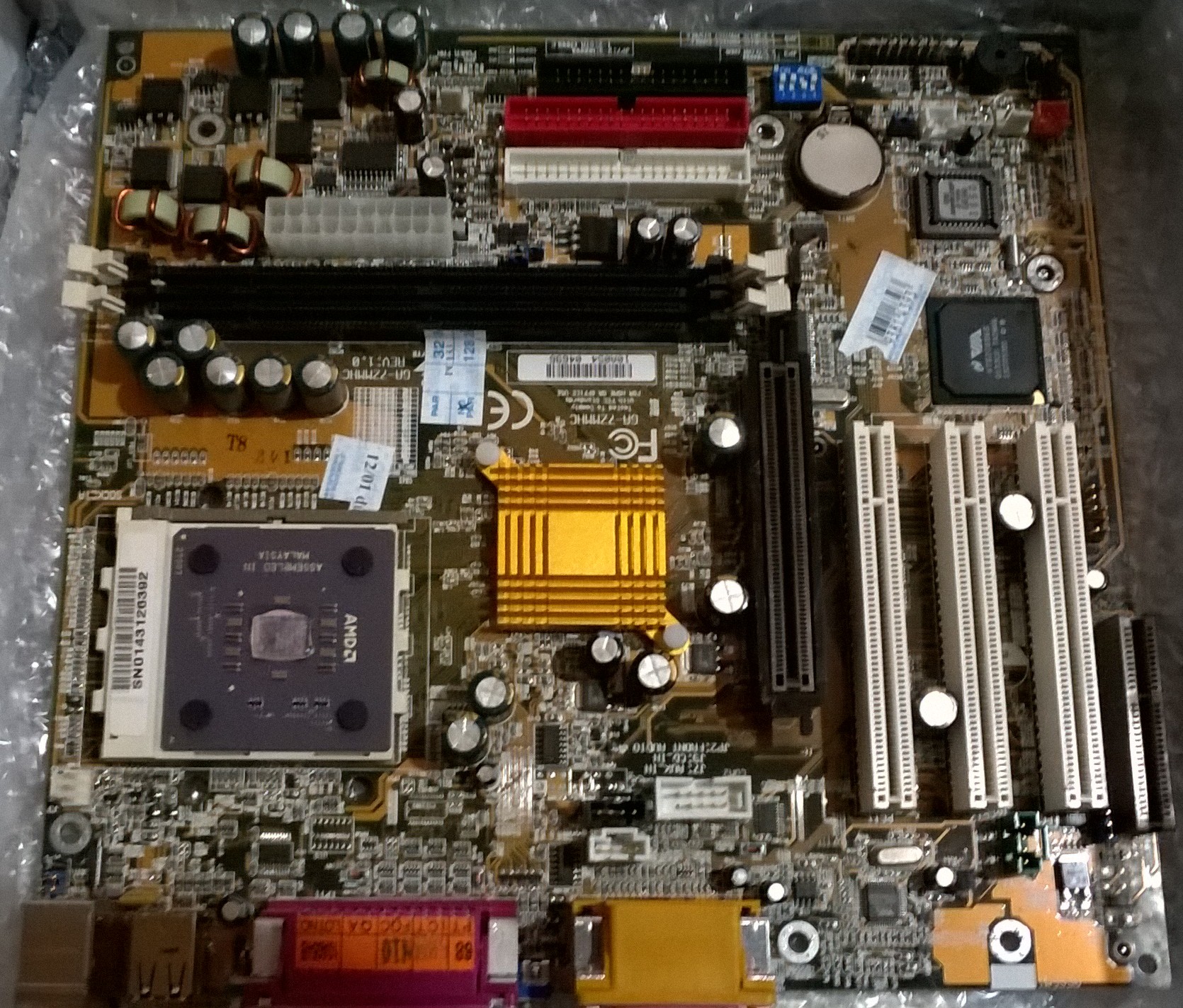 Tornando alle schede old, ho ancora alcune S.462 da sistemare, una è di prima generazione, la scheda è abbastanza in ordine e sembra come nuova, soffre come quelle del periodo di condensatori rigonfi, bisogna cambiarne diversi, ma mi sa che cambio anche quelli visivamente ok (13 in totale), la scheda è Gigabyte GA-7ZMMHC con CPU Duron 1000, ha sia il video che l'audio integrati, ma volendo si può mettere una VGA migliore usando lo slot AGP, usa normali RAM PC133, insomma penso possa essere una alternativa ai PIII da circa 1GHz, questo ovviamente se poi funziona.?