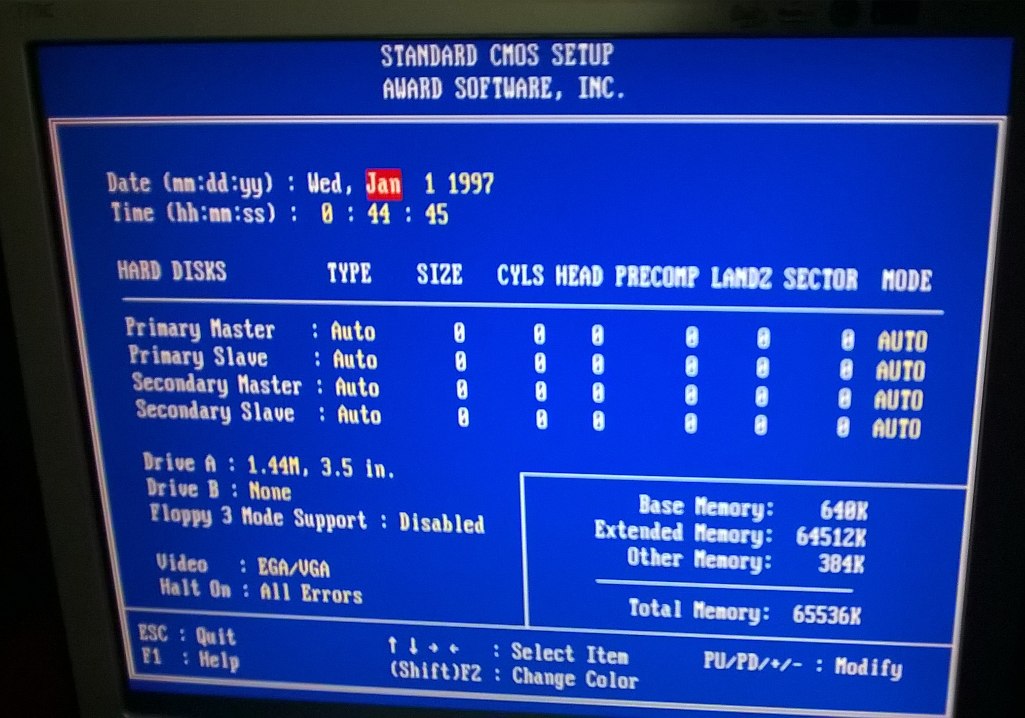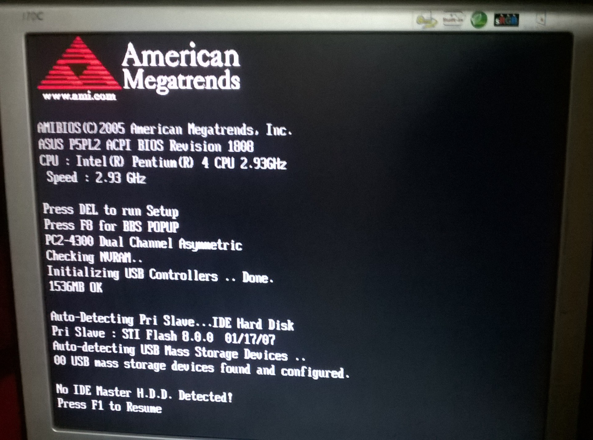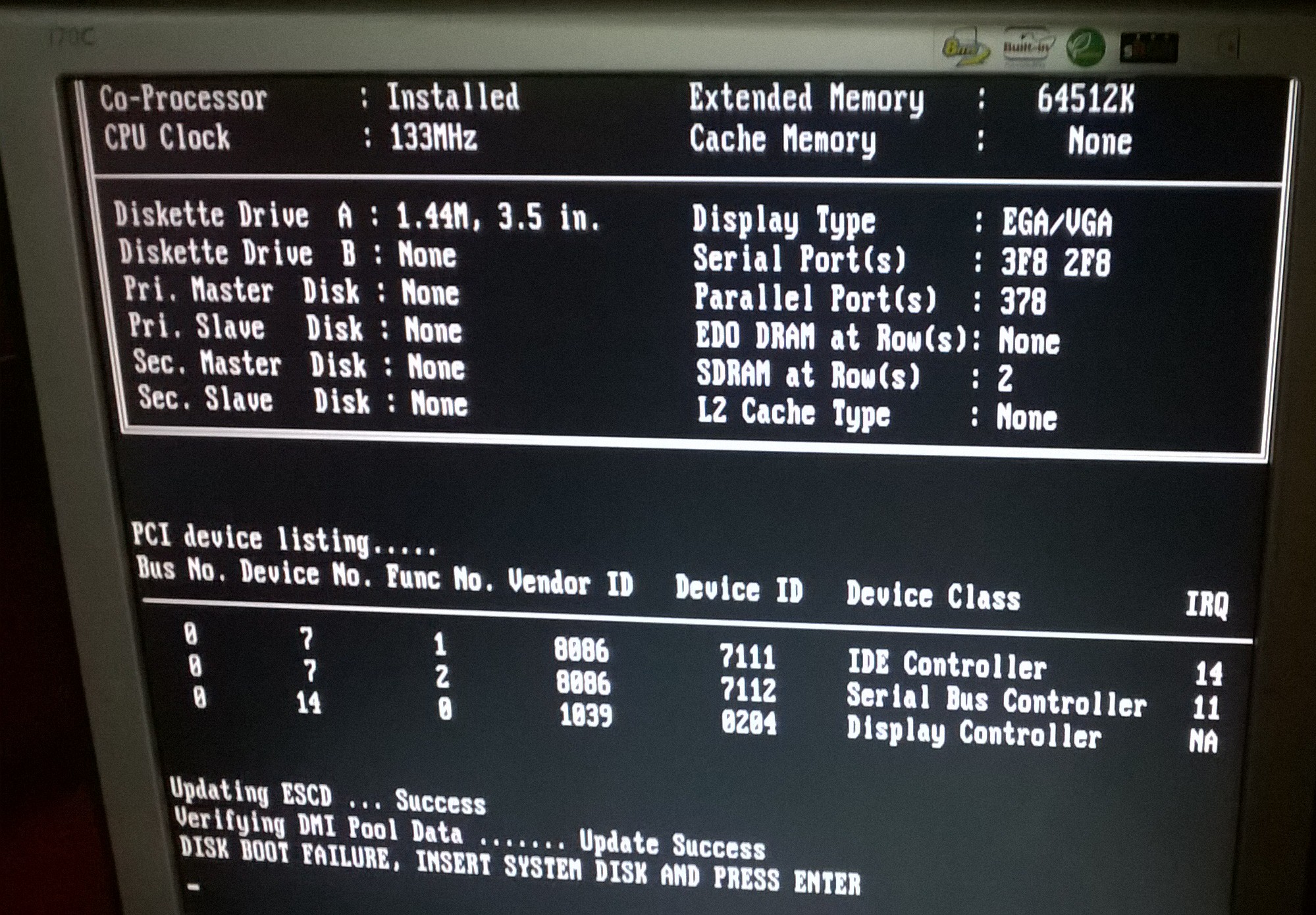 Appare la prima schermata, e riporta alcuni errori, niente di strano a parte quello della tastiera, sembra non funzionare, riprovo l'avvio mettendone un'altra, ma non cambia nulla, così dopo vari tentativi e controlli, riesco ad entrare nel BIOS e quindi a risolvere, memorizzo e provo l'avvio, purtroppo si blocca alla prima schermata, so già che problema c'è, la cache, entro nel BIOS e disabilito quella esterna (L2), salvo e riavvio, sembra tutto ok.