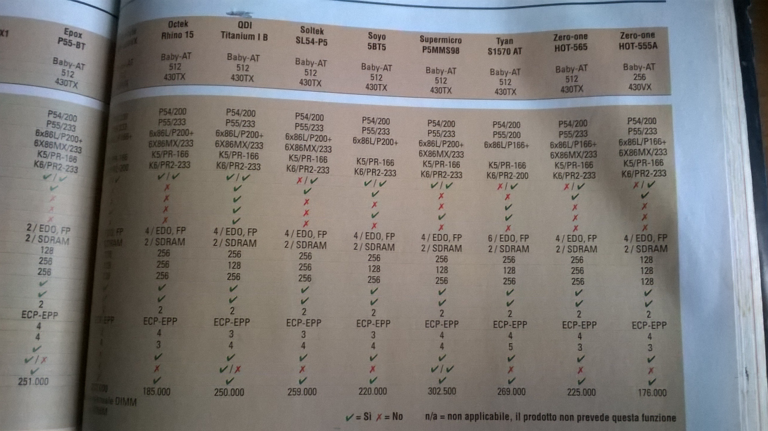 Per caso ho una vecchia rivista di informatica, l'avevo recuperata l'estate scorsa insieme ad HW vario, scelgo questa in particolare perché in copertina c'è scritto "25 schede madri", inizio a sfogliare e trovo qualcosa di veramente interessante, una pubblicità del K6, che quindi è stato messo in commercio da poco, proseguo e trovo alcuni PC che hai tempi potevi solo sognarti (tranne ovviamente se non avevi dietro un'ottima condizione economica), poi arrivo ad articoli interessanti su CPU BIOS CMOS e altro, infine verso le ultime pagine trovo alcune delle schede madri in prova, tra queste ne scelgo (per il momento) alcune, perché ne ho di simili (o uguali?), ne ho scelto quattro in formato AT, anzi per la precisione Baby AT, alcune sono di produttori ormai spariti, ed hanno già funzioni come il riconoscimento automatico della CPU (e relative tensioni), o i regolatori di tensione switching (invece del lineare), ovviamente ho scelto quelle con chipset intel 430, ma erano presenti tra le altre schede chipset diversi, e escludo per il momento quelle in formato ATX, perché a quei tempi erano uscite pochi anni prima, e richiedevano un cambio di case e alimentatore, cosa che a quei tempi non era proprio economica.