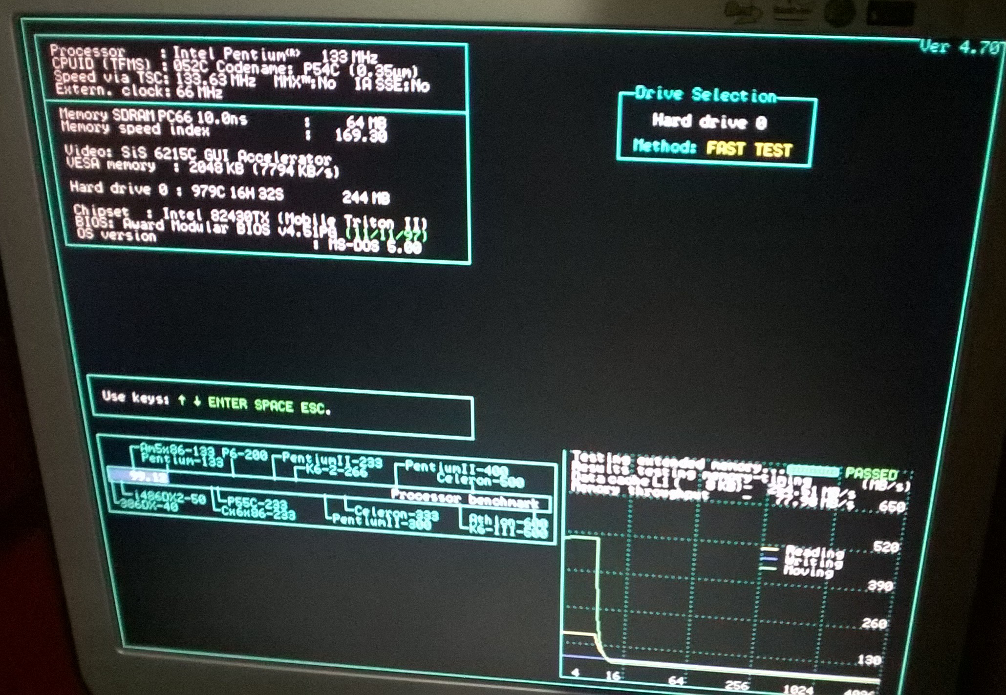 Al riavvio il PC rileva il drive e il PC avvia il DOS contenuto nel CF da 256MB, da li avvio qualche programma di diagnostica e di bench, ovviamente ottengo dei risultati, che non saprei valutare in assoluto se siano buoni o meno.
