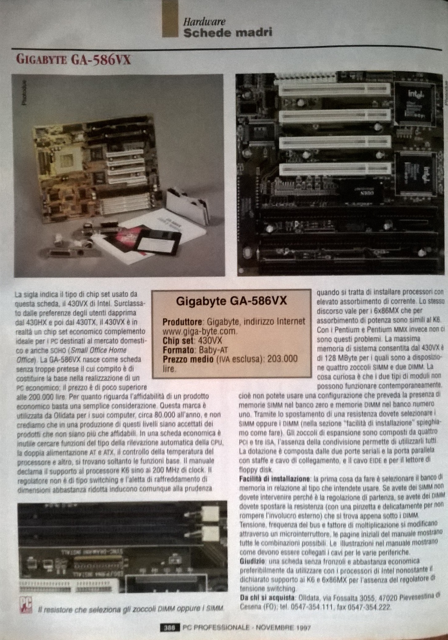 Stranamente invece le Mobo Gigabyte non erano così costose come oggi, anzi la GA-586VX era addirittura tra quelle più economiche, anche se bisogna precisare che il chipset Intel i430VX era ormai già sorpassato.