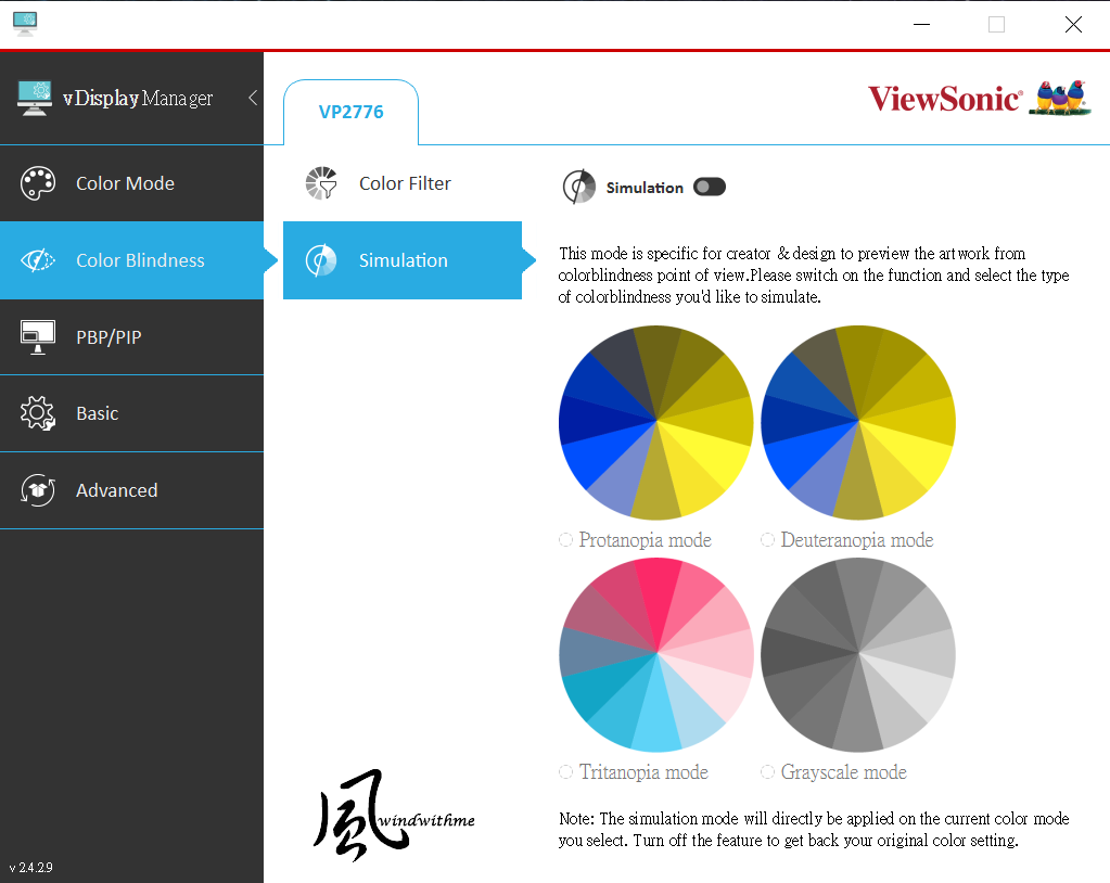 There are two main software packages included. First, vDisplay Manager: the left-side menu options are Color Mode, Color Blindness, PBP/PIP, Basic, and Advanced. In Color Mode, the Standard Color menu provides four color standards to choose from.