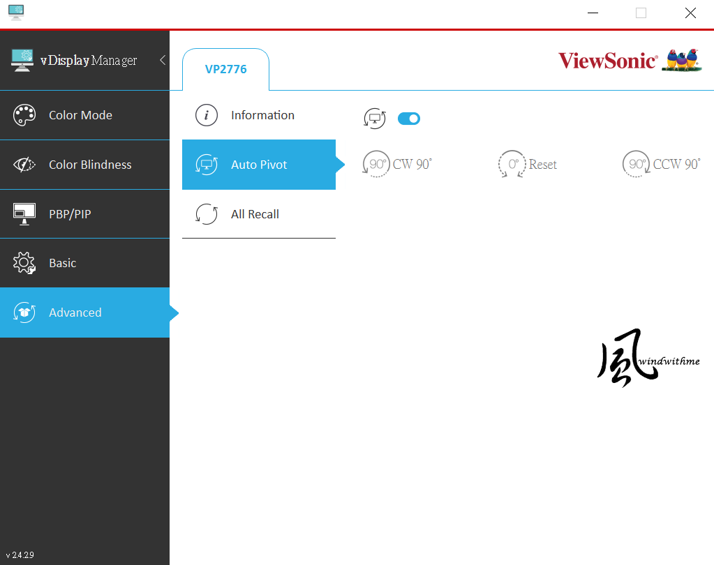 The Advanced page shows information and options for resetting defaults and rotating the display. When the screen is pivoted to a portrait orientation, the Auto Pivot function will rotate the display accordingly. English and Japanese language options are available, hopefully with more to be added in future.