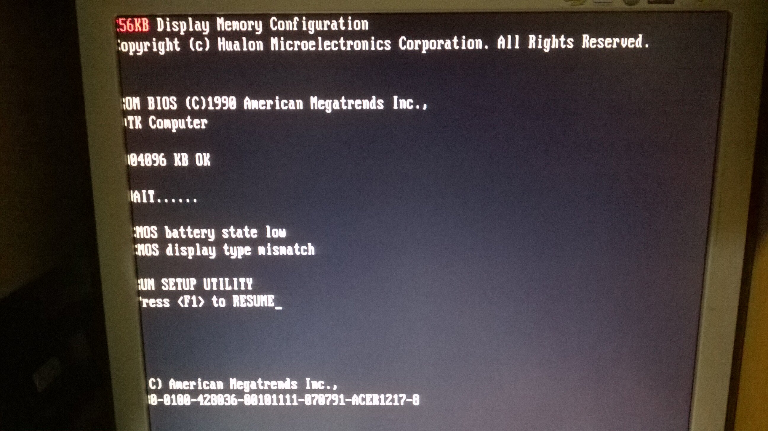 Purtroppo ha un chip RTC dallas con batteria scarica, bisogna fare il MoD., è un DS12887, non è tanto per la Batteria scarica ma per le info del BIOS che ad ogni avvio si perdono, inoltre c'è un baco al bios almeno per il momento non si entra premendo F1, premendolo il PC si blocca. L'unica cosa possibile è avviarlo da floppy. ma anche qui per il momento non va, forse è il lettore oppure i floppy che difettano, dovrei provarne altri sicuramente funzionanti e vedere che succede (cioè se parte).