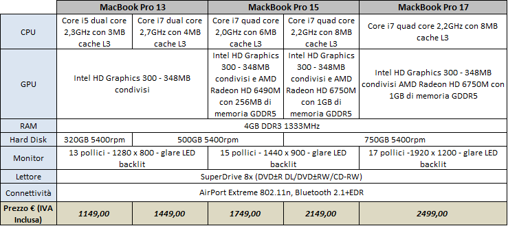 Ieri è stata l'occasione per Apple per presentare ufficialmente la nuova linea di MacBook Pro. Tante le innovazioni presenti, a partire dall'uso delle nuove cpu Sandy Bridge di Intel, passando per l'utilizzo di GPU AMD, fino all'implementazione del connettore "Thunderbolt".Annunciati ufficialmente da Apple nella giornata di ieri i nuovi modelli MacBook Pro. Le novità principali coinvolgono 3 settori: CPU, GPU e connessioni esterne.