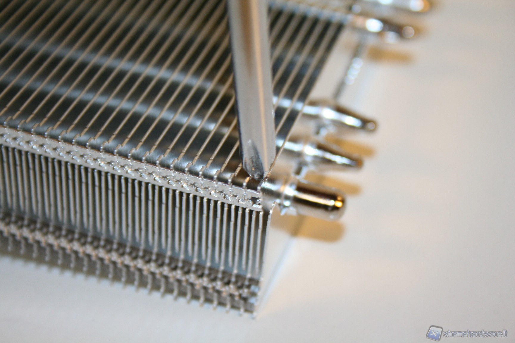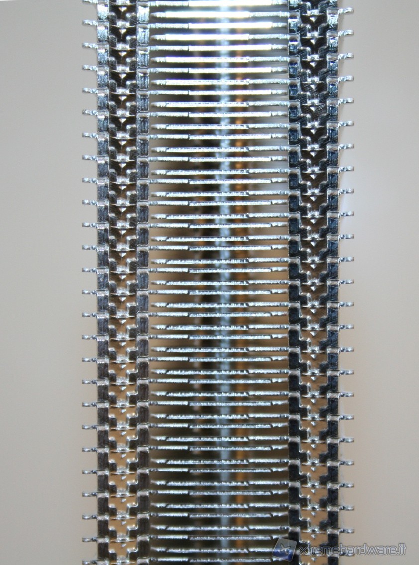 In merito al primo punto, probabilmente la questione è da ricercarsi nell’assemblaggio stesso e nell’intenzione di conferire una maggiore solidità strutturale al corpo centrale, a dimostrazione di questo è da notare la finitura delle alette lateralmente, che difatti è identica. La lavorazione complessiva è decisamente impressionante e per un prodotto del genere fa piacere constatare la cura riposta dietro una soluzione tanto economica. Le heatpipes non presentano sovrapposizione quindi saranno investite da un flusso d’aria che non permetterà la formazione di zone morte o ricircoli eccessivi, sebbene comunque sia presente un piccolo cono d’ombra dietro ad ogni heatpipe; purtroppo non sono state adottate soluzioni aventi, su ogni aletta, dei piccoli disegni triangolari, utili al fine di spezzare il flusso d’aria ed investire direttamente la porzione posteriore dell’heatpipe stessa. Ad ogni modo è solo un accorgimento tecnico la cui assenza non comprometterà di certo le prestazioni complessive. È interessante invece notare la struttura delle alette perché sembra che sia stata adottata anche nella versione potenziata ‘’Panther’’ ma, non negli ultimi dissipatori, quali ad esempio il Prolimatech Armageddon. Che sia un’innovazione architetturale agli albori ?