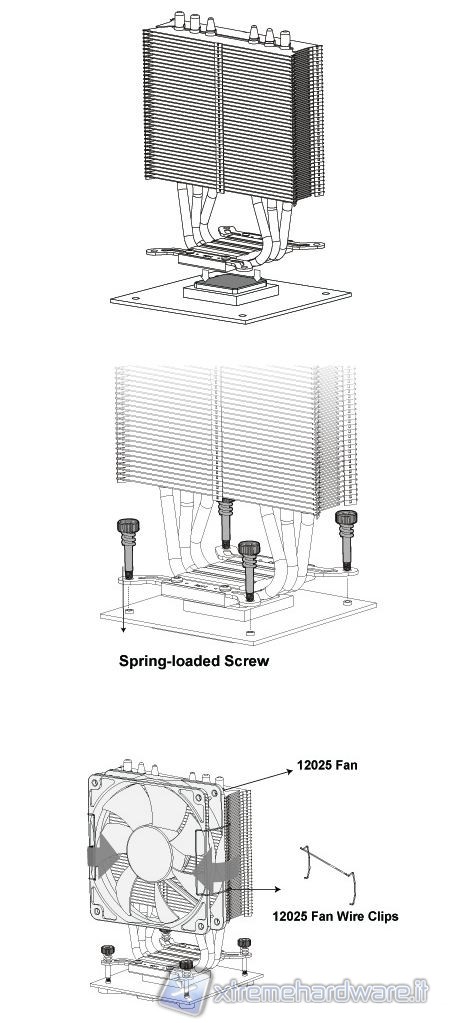 Il sistema di montaggio si è rivelato tanto semplice quanto efficace. Lo stesso prevede l'uso di quattro viti che presentano un sistema di bilanciamento della pressione tramite delle molle pre-installate; dovranno essere avvitate nei fori presenti sul backplate posteriore. Al fine di evitare un’eccessiva pressione sul PCB della scheda madre, sono anche dotate di fine corsa, cosi non c'è pericolo di stringerne una più delle altre; consigliamo comunque di non serrarle fino al termine della corsa in quanto così facendo si applica una pressione forse eccessiva. Il montaggio non è stato difficoltoso, ma sarebbe stato preferibile utilizzare delle strisce di biadesivo tra il backplate ed il PCB della scheda madre. Data l’assenza di questo sistema, il backplate stesso va tenuto in posizione manualmente e solo dopo andranno avvitate le viti, con il dissipatore già posizionato al di sopra della CPU stessa. Un sistema simile alle soluzioni Thermalright, che però appunto hanno il biadesivo. Il sistema di fissaggio della ventola è elementare, ma molto efficace, oltre ad essere davvero pratico. Mettere la ventola in posizione richiede solo pochi secondi. Ricordiamo che in dotazione sono presenti due clip in più per poter utilizzare anche una seconda ventola, cosa che consigliamo decisamente dato l’ingombro davvero ridotto ai minimi termini.