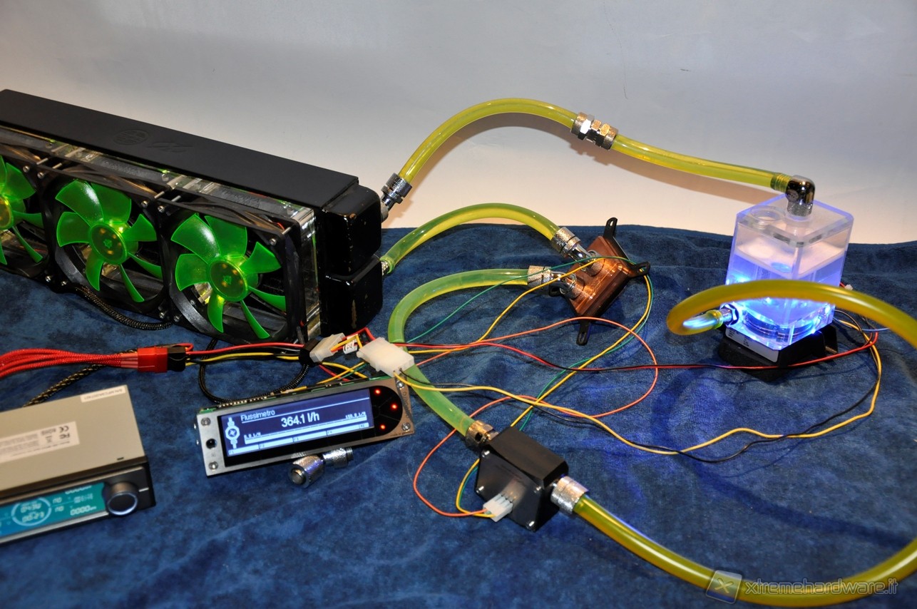 La Alphacool VPP655 corredata di HF Top Plexi D5 si è posizionata nella fascia media, battendo la Phobya DC400 ma non la Swiftech MCP355, avvantaggiata dal TOP Reservoir della XSPC. Abbiamo quindi aggiunto al circuito altri 2 waterblock per sovraccaricare ulteriormente il lavoro delle pompe e vedere come scalano in prestazioni. Lo schema è il seguente: