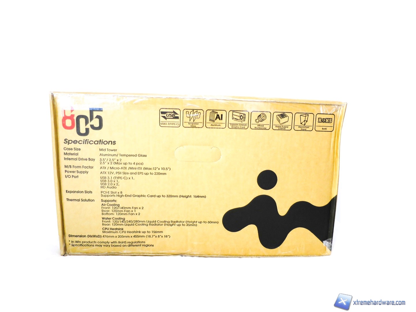 Come altri modelli anche il modello In Win 805 ci giungerà in una confezione di cartone abbastanza spessa e di dimensioni medie. Su questa troviamo le varie informazioni e specifiche/caratteristiche circa il prodotto. Non manca inoltre un adesivo che ci ricorda che all’interno della confezione insieme al case troveremo anche un supporto per Headseta ventosa omaggio di In Win per l’acquisto di questo fantastico case che renderà dunque completa la nostra configurazione da gaming o da lavoro.