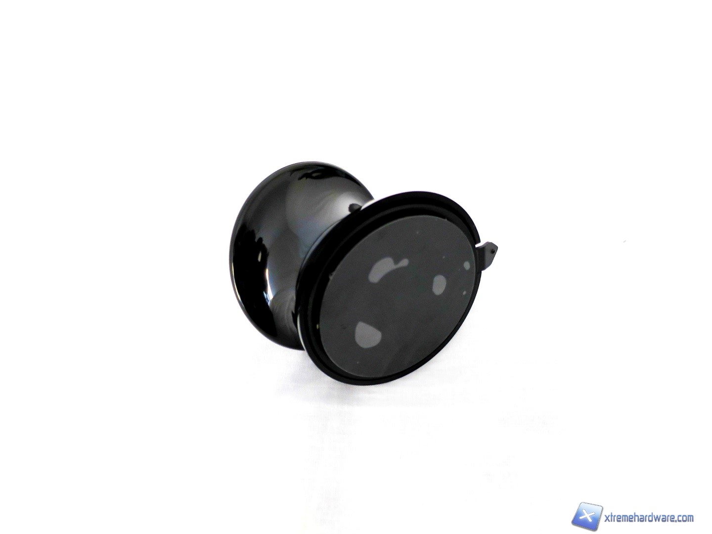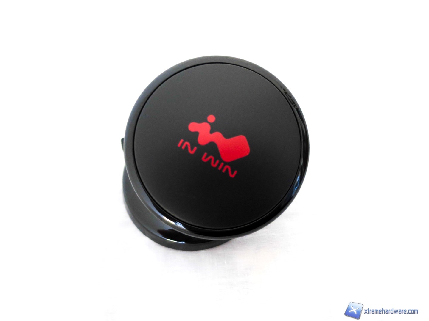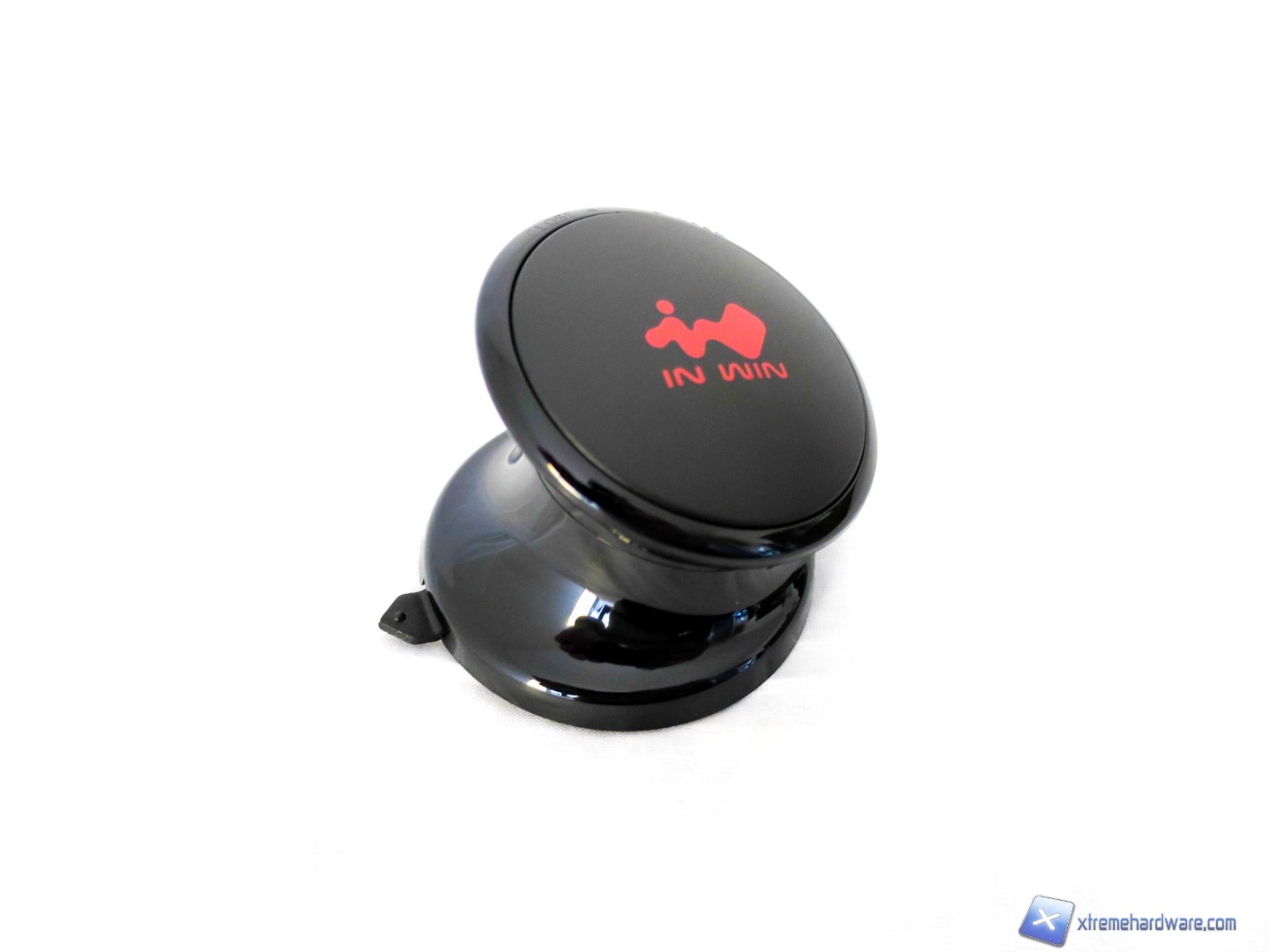 A seguire, un dettaglio dell’Headset Holder incluso nella confezione. Colorazione nera in contrasto al logo del brand In Win di colore rosso, dimensioni compatte, superficie in plastica liscia e lucida e dotato nella parte inferiore di una ventosa. Il funzionamento è davvero semplice: rimosso il film adesivo in corrispondenza della ventosa ed una volta poggiato sulla superficie di nostro interesse, ci basterà un semplice gesto rotatorio per far sì che la ventosa faccia presa e dunque avere l’Holder fissato e pronto ad accogliere il nostro headset accanto al nostro In Win 805.